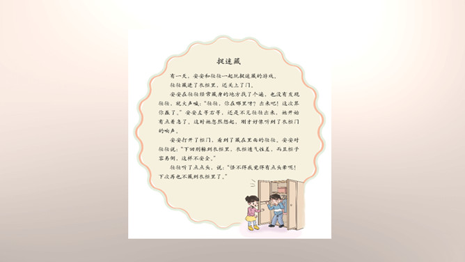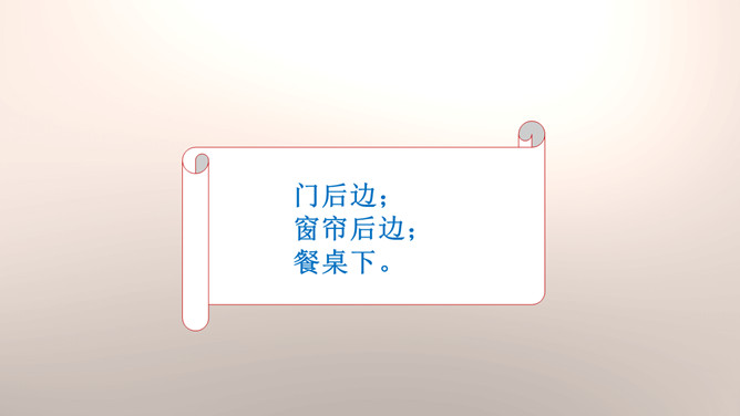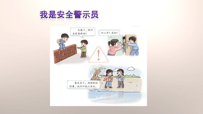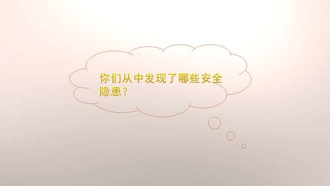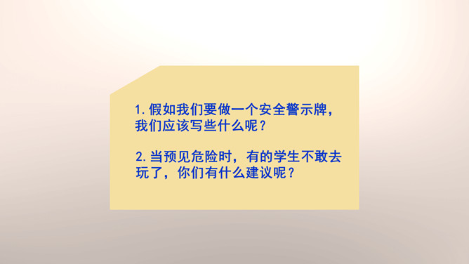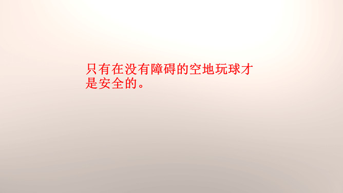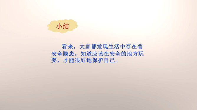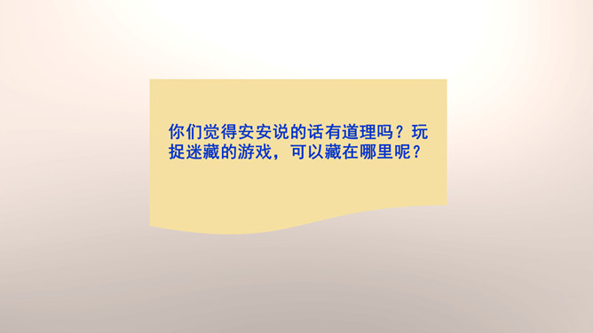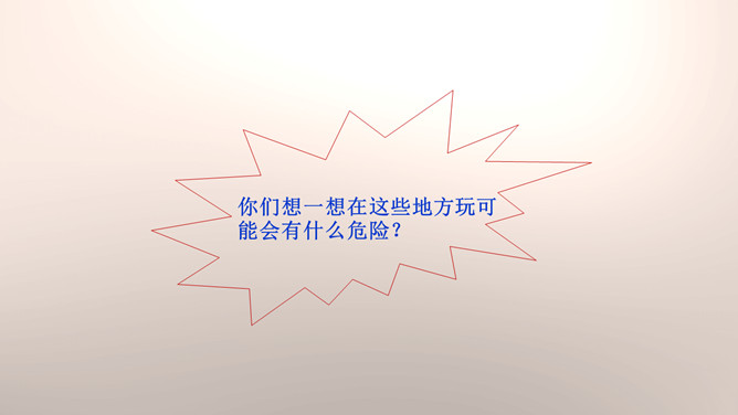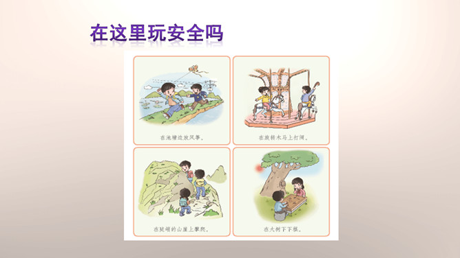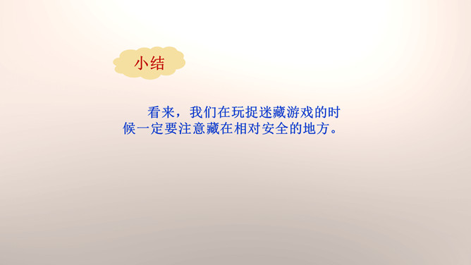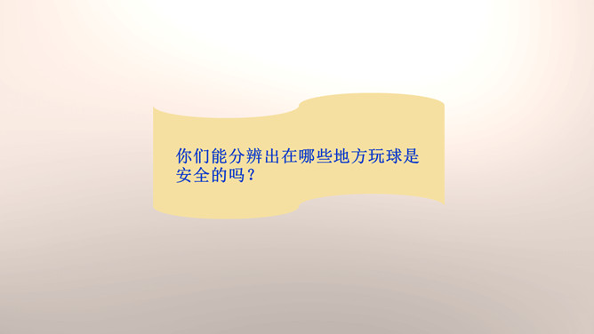 你们能分辨出在哪些地方玩球是安全的吗?看来,大家都发现生活中存在着安全隐患,知道应该在安全的地方玩耍,才能很好地保护自己。你们想一想在这些地方玩可能会有什么危险?你们想一想在这些地方玩可能会有什么危险?门后边;窗帘后边;餐桌下。看来,我们在玩捉迷藏游戏的时候一定要注意藏在相对安全的地方。1.假如我们要做一个安全警示牌,我们应该写些什么呢?2.当预见危险时,有的学生不敢去玩了,你们有什么建议呢?我们要做一个勇敢的人,积极面对危险,不卑不亢。所属专题:安全地玩ppt。