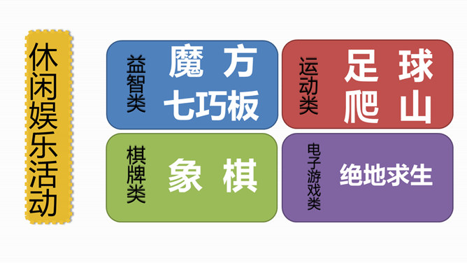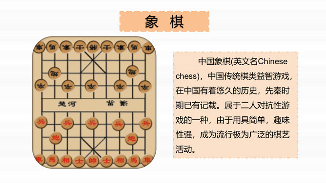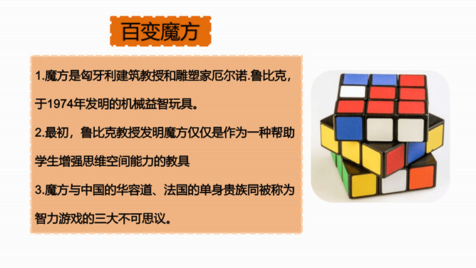 百变魔方:1.魔方是匈牙利建筑教授和雕塑家厄尔诺.鲁比克,于1974年发明的机械益智玩具。2.最初,鲁比克教授发明魔方仅仅是作为一种帮助学生增强思维空间能力的教具。3.魔方与中国的华容道、法国的单身贵族同被称为智力游戏的三大不可思议。足球,有"世界第一运动"的美誉,是全球体育界最具影响力的单项体育运动之一。标准的足球比赛由两队各派10名球员与1名守门员,共11人,在长方形的草地球场上对抗、进攻、防守。中国象棋(英文名Chinese chess),中国传统棋类益智游戏,在中国有着悠久的历史,先秦时期已有记载。所属专题:安全地玩ppt。