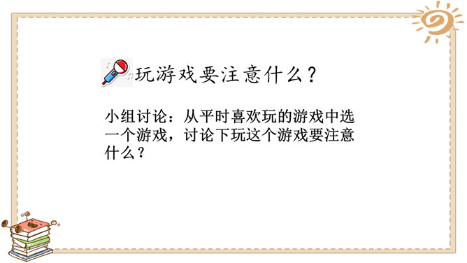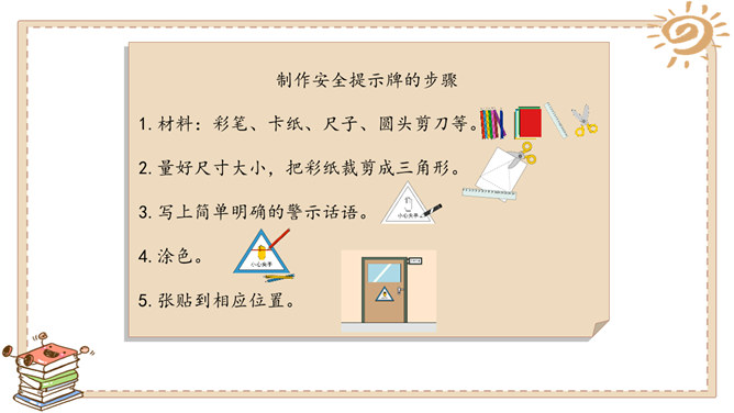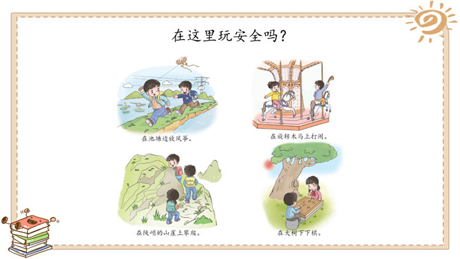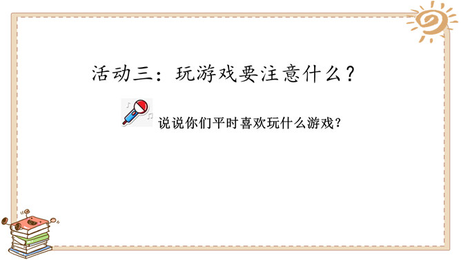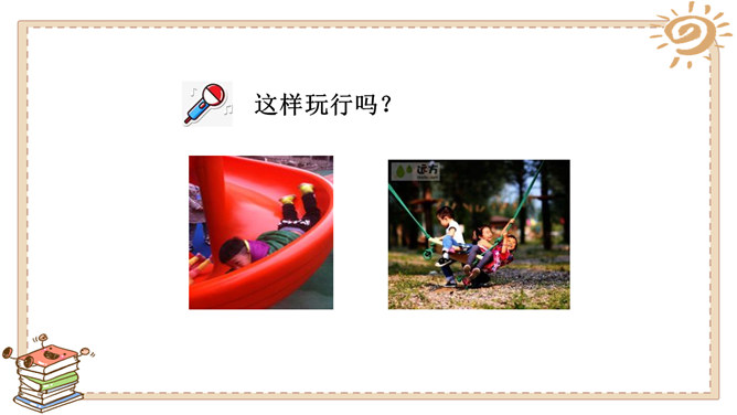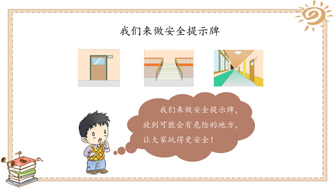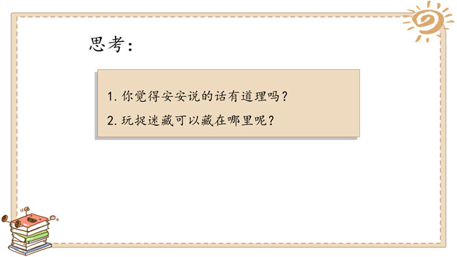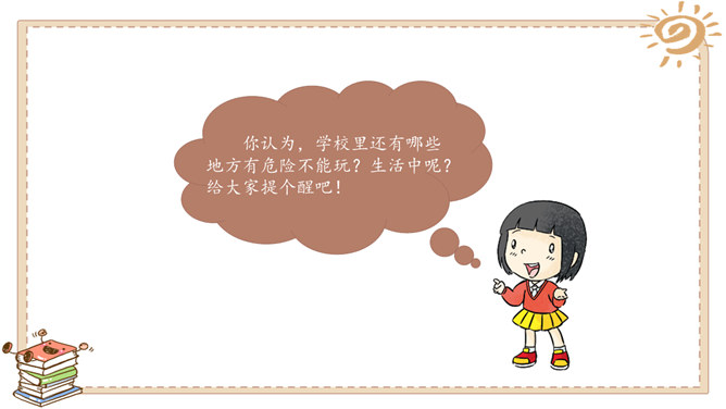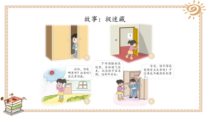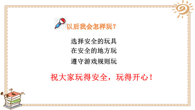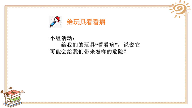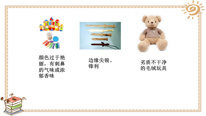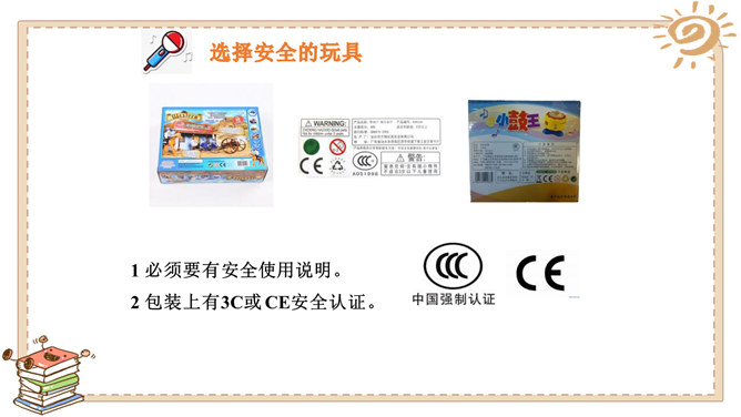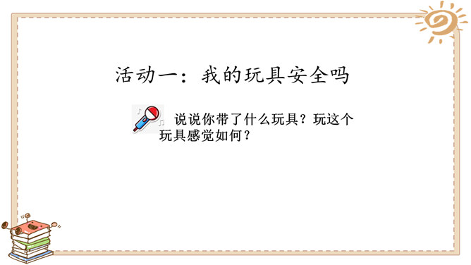 活动一:我的玩具安全吗?说说你带了什么玩具?玩这个玩具感觉如何?小组活动:给我们的玩具“看看病”,说说它可能会给我们带来怎样的危险?颜色过于艳丽,有刺鼻的气味或浓郁香味。边缘尖锐、锋利。劣质不干净的毛绒玩具。活动二:我们在哪里玩?壮壮,你在哪里呀?出来吧!这次算你赢。下回别躲到衣柜里,衣柜透气性差,而且柜子容易倒,这样不安全。安安,怪不得我觉得有点头晕呢!下次再也不藏到衣柜里了。思考:1.你觉得安安说的话有道理吗?2.玩捉迷藏可以藏在哪里呢?所属专题:安全地玩ppt。