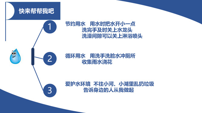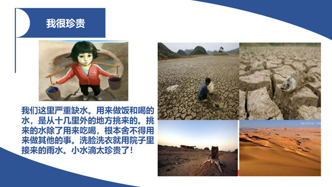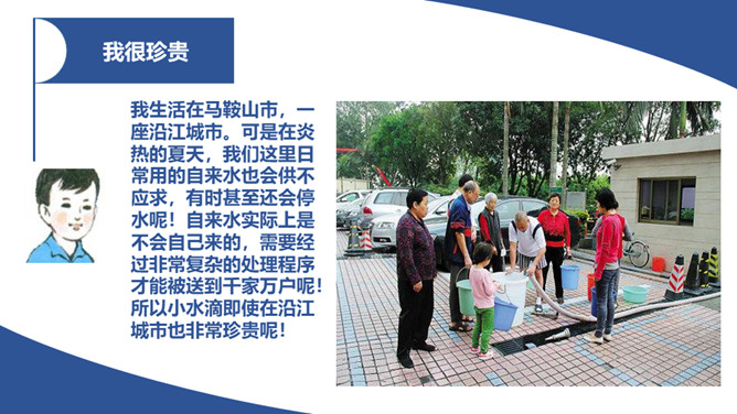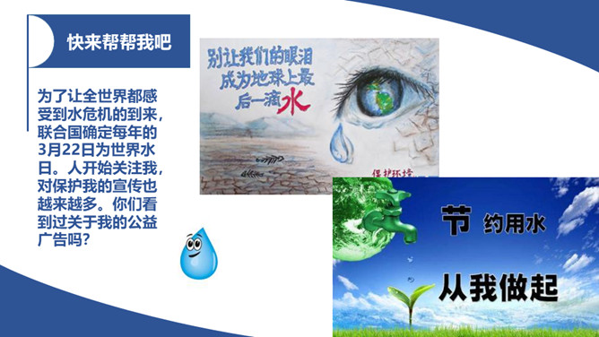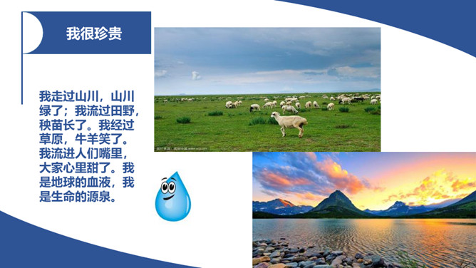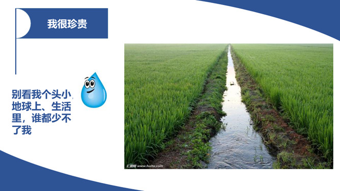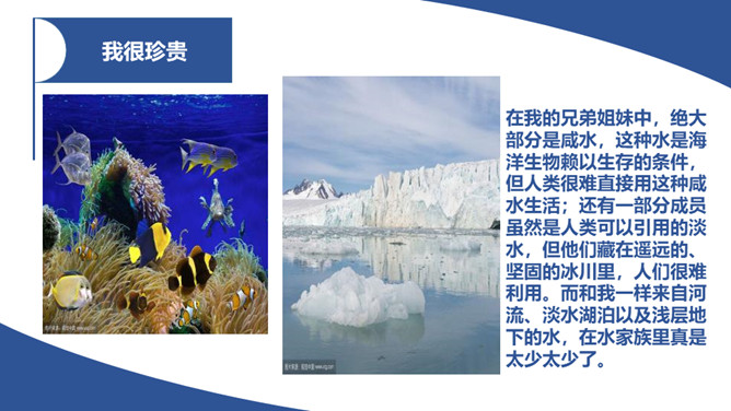 别看我个头小,地球上、生活里,谁都少不了我。我走过山川,山川绿了;我流过田野,秧苗长了。我经过草原,牛羊笑了。我流进人们嘴里,大家心里甜了。我是地球的血液,我是生命的源泉。在我的兄弟姐妹中,绝大部分是咸水,这种水是海洋生物赖以生存的条件,但人类很难直接用这种咸水生活;还有一部分成员虽然是人类可以引用的淡水,但他们藏在遥远的、坚固的冰川里,人们很难利用。而和我一样来自河流、淡水湖泊以及浅层地下的水,在水家族里真是太少太少了。所属专题:小水滴的诉说ppt。
