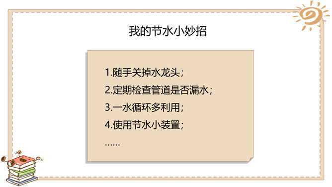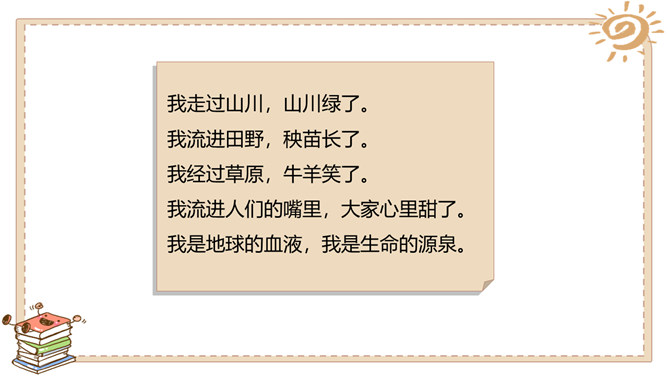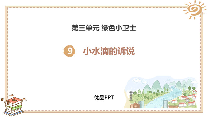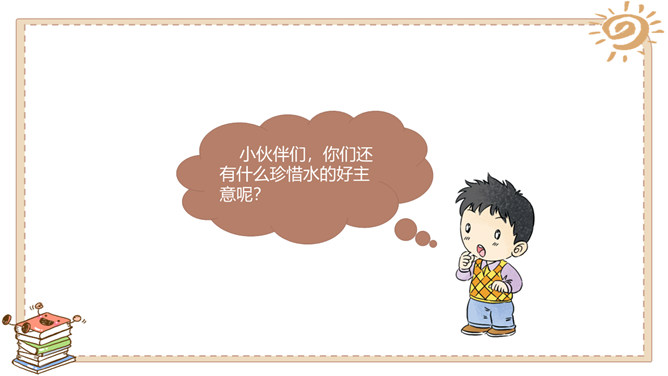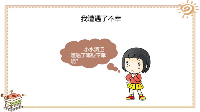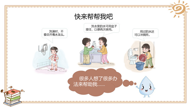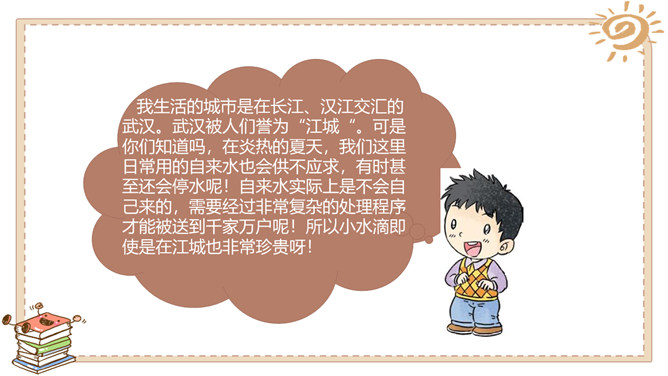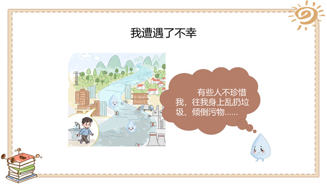 活动一:我很珍贵。我生活的城市是在长江、汉江交汇的武汉。武汉被人们誉为“江城“。可是你们知道吗,在炎热的夏天,我们这里日常用的自来水也会供不应求,有时甚至还会停水呢!自来水实际上是不会自己来的,需要经过非常复杂的处理程序才能被送到千家万户呢!所以小水滴即使是在江城也非常珍贵呀!活动二:我遭遇了不幸。有些人不珍惜我,往我身上乱扔垃圾、倾倒污物……小水滴还遭遇了哪些不幸呢?活动三:快来帮帮我吧。很多人想了很多办法来帮助我……小伙伴们,你们还有什么珍惜水的好主意呢?所属专题:小水滴的诉说ppt。