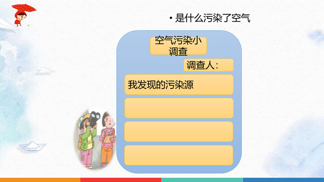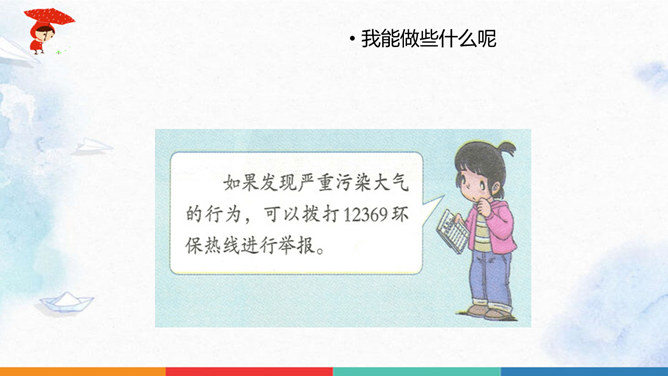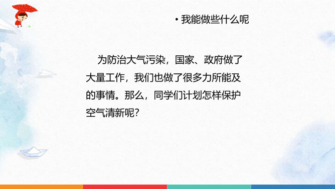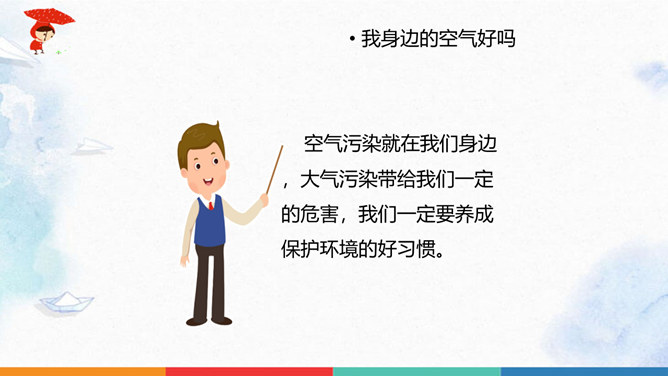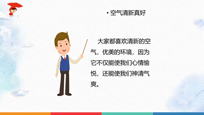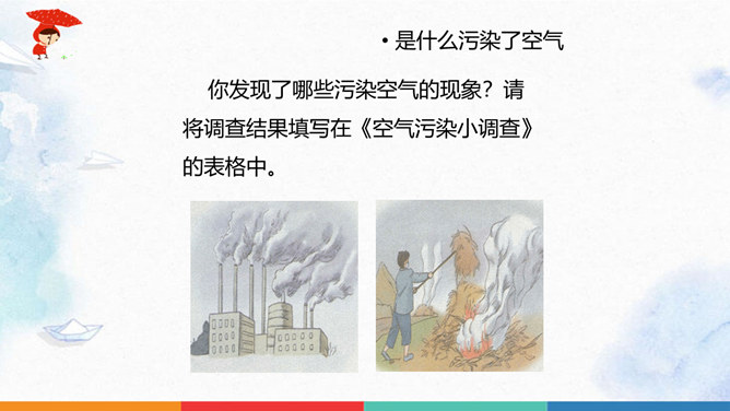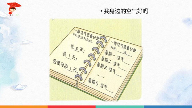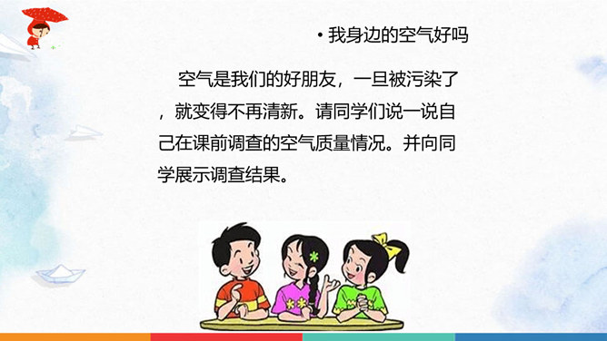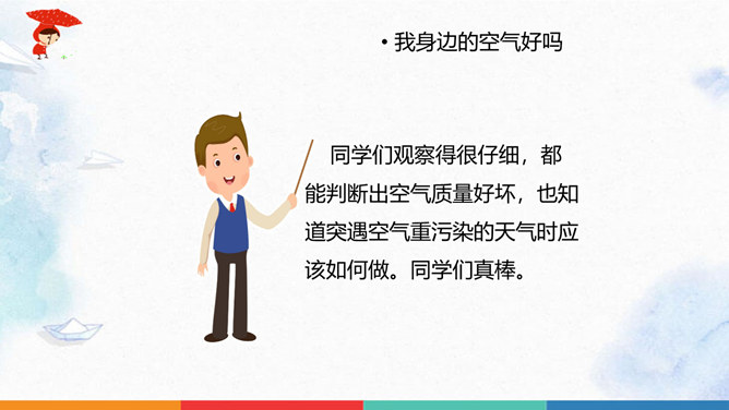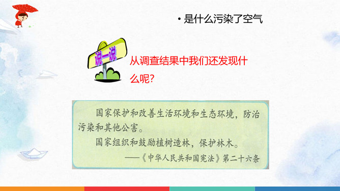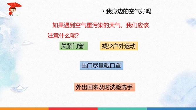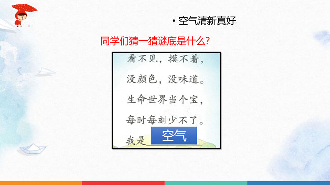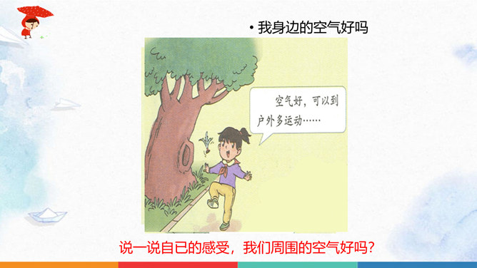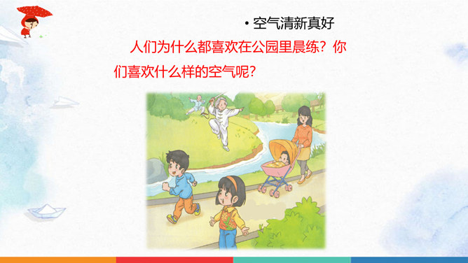 同学们猜一猜谜底是什么?人们为什么都喜欢在公园里晨练?你们喜欢什么样的空气呢?大家都喜欢清新的空气,优美的环境,因为它不仅能使我们心情愉悦,还能使我们神清气爽。说一说自已的感受,我们周围的空气好吗?空气是我们的好朋友,一旦被污染了,就变得不再清新。请同学们说一说自己在课前调查的空气质量情况。并向同学展示调查结果。如果遇到空气重污染的天气,我们应该注意什么呢?同学们观察得很仔细,都能判断出空气质量好坏,也知道突遇空气重污染的天气时应该如何做。同学们真棒。所属专题:清新空气是个宝ppt。