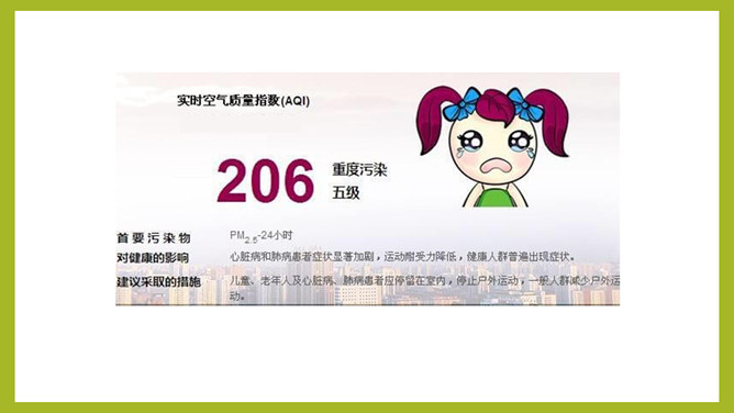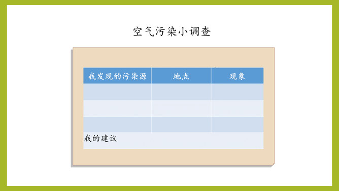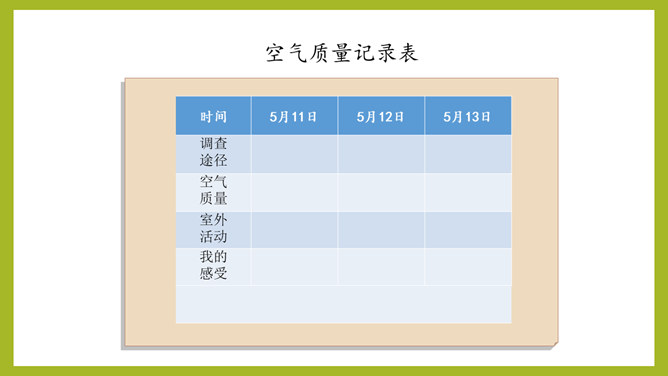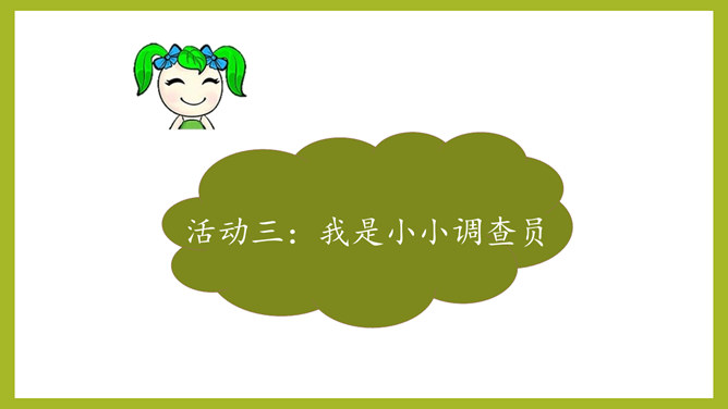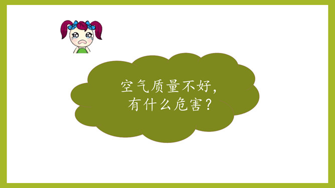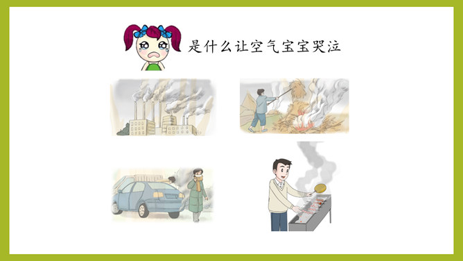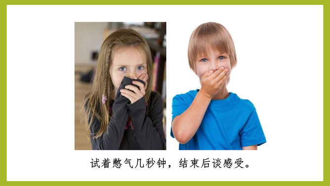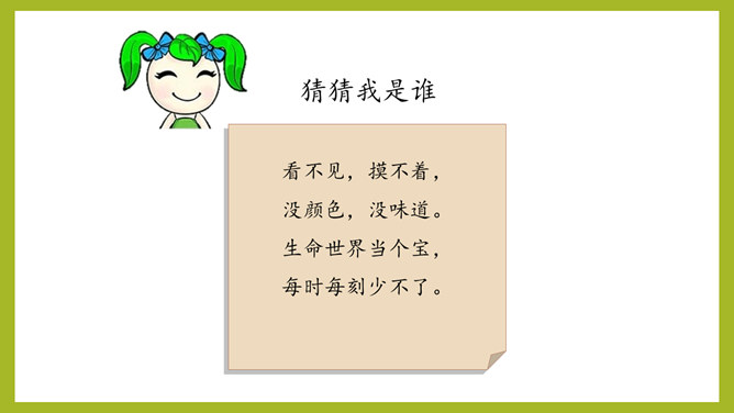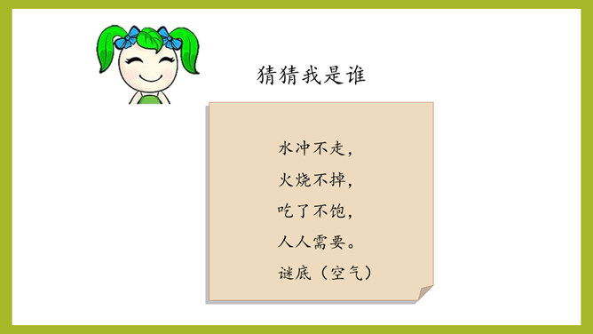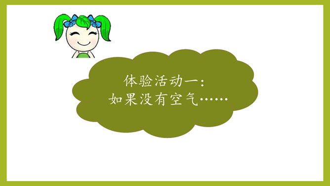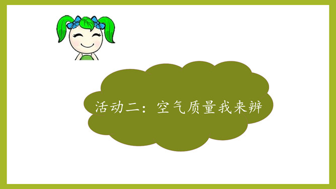 猜猜我是谁:水冲不走,火烧不掉,吃了不饱,人人需要。体验活动一:如果没有空气……试着憋气几秒钟,结束后谈感受。活动二:空气质量我来辨。空气清新生活好。空气质量不好,有什么危害?活动三:我是小小调查员。是什么让空气宝宝哭泣。活动四:保护空气从我做起。引用法规进行劝说。向相关部门举报。保护空气从我做起。亲爱的小朋友们,清新的空气是我们时时刻刻都离不开的宝。希望我们共同努力。让我们一起行动起来,尽自己的一份责任,保护我们的空气宝宝!所属专题:清新空气是个宝ppt。