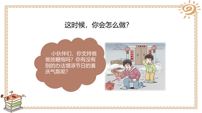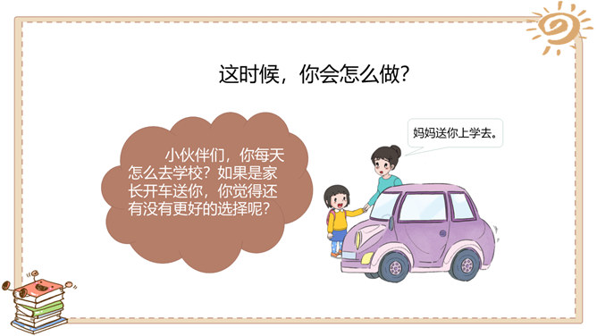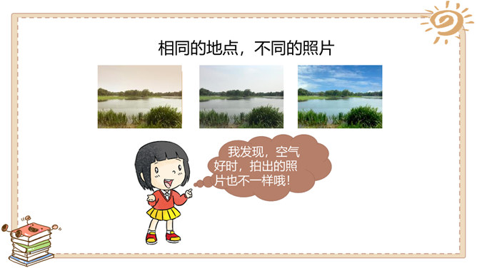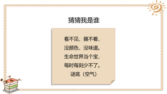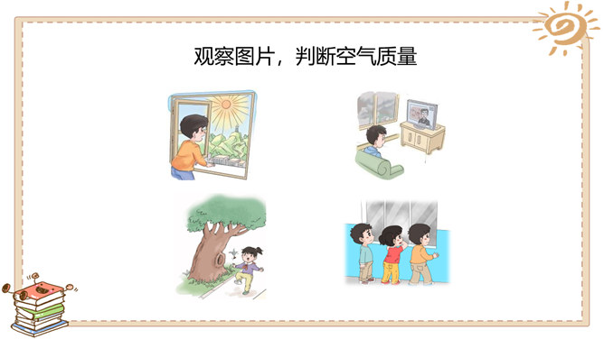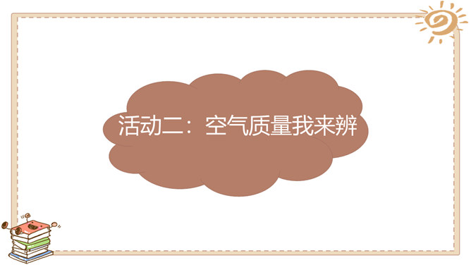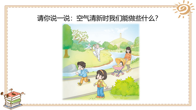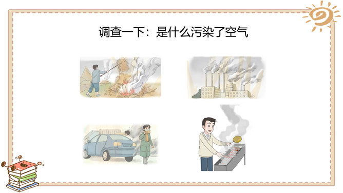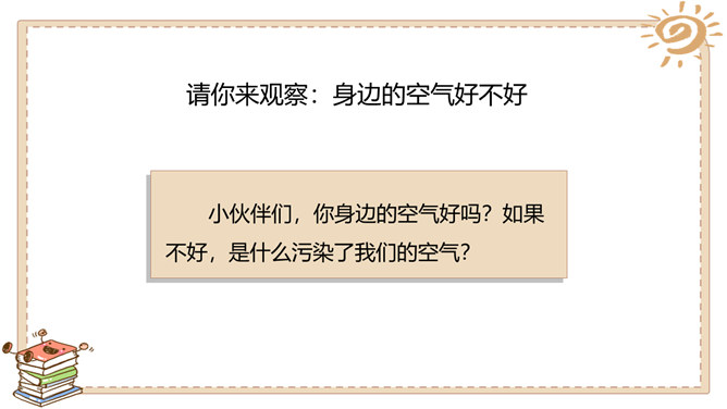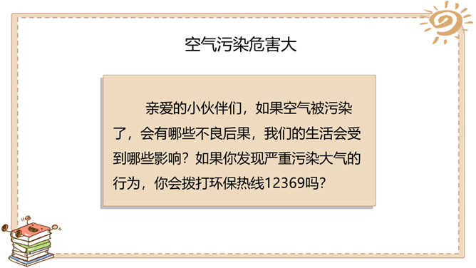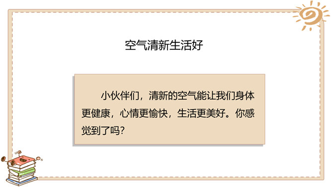 小伙伴们,清新的空气能让我们身体更健康,心情更愉快,生活更美好。你感觉到了吗?小伙伴们,你身边的空气好吗?如果不好,是什么污染了我们的空气?亲爱的小伙伴们,如果空气被污染了,会有哪些不良后果,我们的生活会受到哪些影响?如果你发现严重污染大气的行为,你会拨打环保热线12369吗?小伙伴们,你支持爸爸放鞭炮吗?你有没有别的办法增添节日的喜庆气氛呢?小伙伴们,你每天怎么去学校?如果是家长开车送你,你觉得还有没有更好的选择呢?让我们一起行动起来,尽自己的一份责任,保护我们的地球妈妈!所属专题:清新空气是个宝ppt。