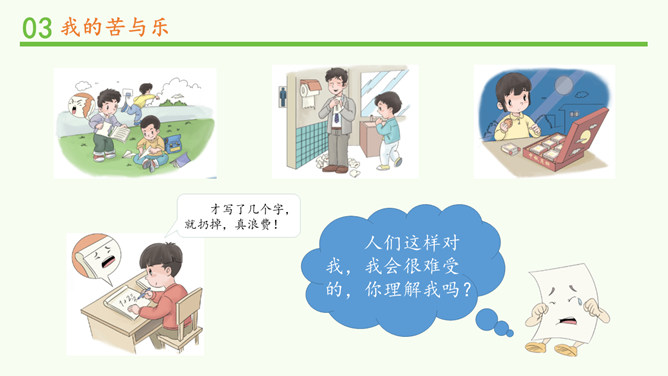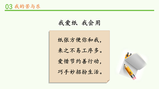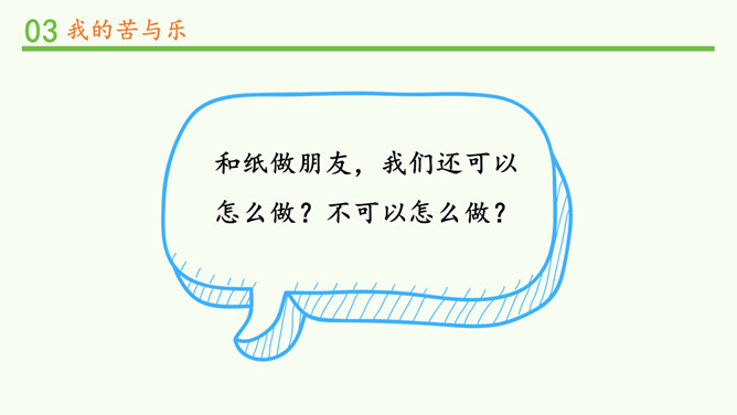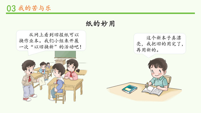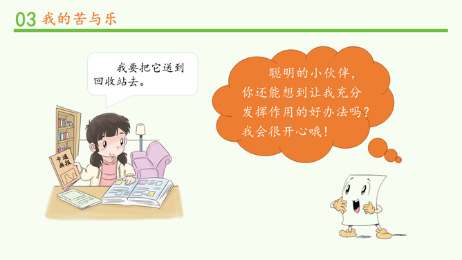 才写了几个字,就扔掉,真浪费!人们这样对我,我会很难受的,你理解我吗?从网上看到旧报纸可以换作业本。我们小组来开展一次“以旧换新”的活动吧!这个新本子真漂亮,我把旧的用完了,再用新的。我要把它送到回收站去。聪明的小伙伴,你还能想到让我充分发挥作用的好办法吗?我会很开心哦!和纸做朋友,我们还可以怎么做?不可以怎么做?纸张方便你和我,来之不易工序多。爱惜节约善行动,巧手妙招扮生活。所属专题:我是一张纸ppt。
