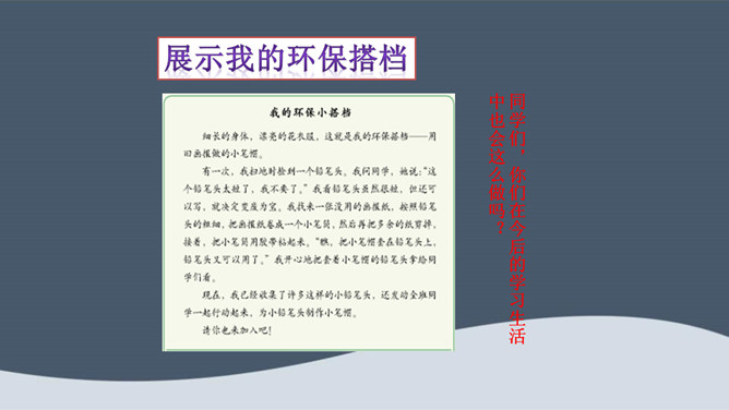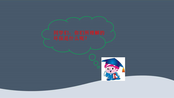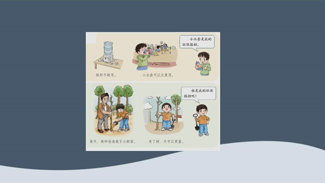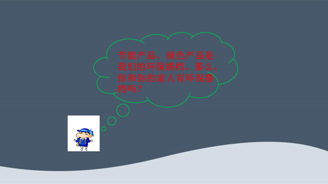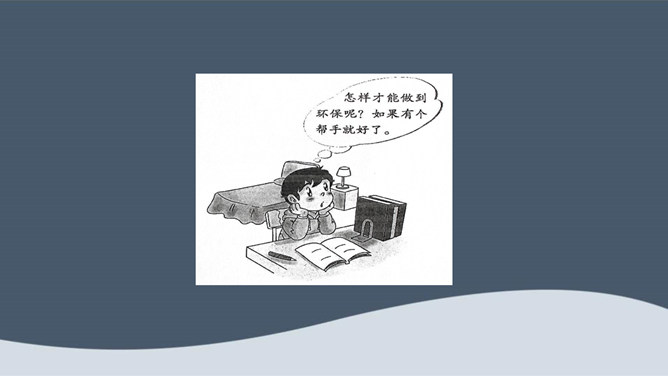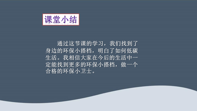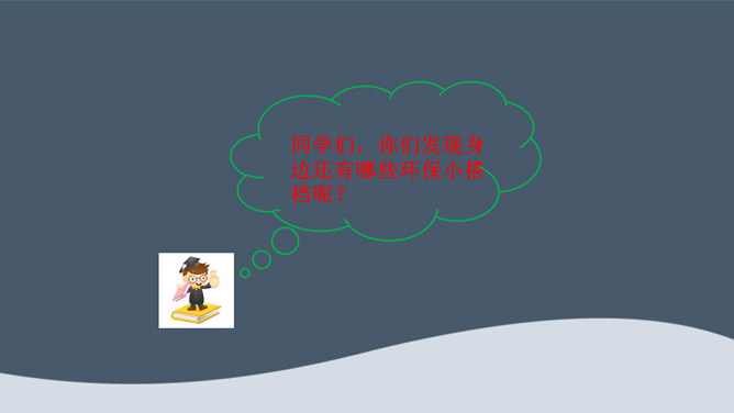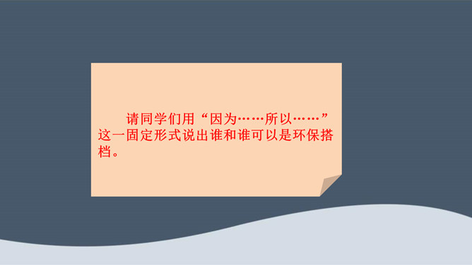 地球是我们的家园,需要我们爱护她。那么,我们怎样保护地球,让我们的家园更美好呢?同学们,你们所理解的环保是什么呢?同学们,你们能找到环保的小帮手吗?同学们,你们发现身边还有哪些环保小搭档呢?请同学们用“因为……所以……” 这一固定形式说出谁和谁可以是环保搭档。同学们,你们在今后的学习生活中也会这么做吗?节能产品、绿色产品是我们的环保搭档。那么,你和你的家人有环保搭档吗?通过这节课的学习,我们找到了身边的环保小搭档,明白了如何低碳生活。所属专题:我的环保小搭档ppt。