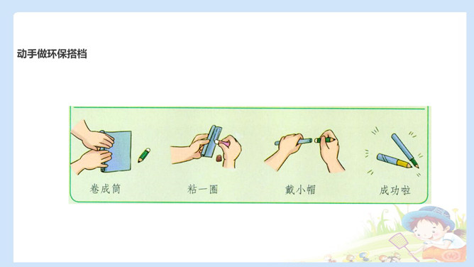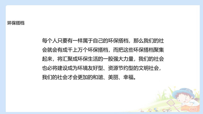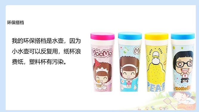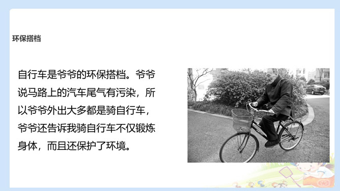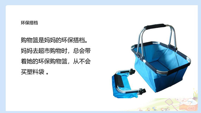 自行车是爷爷的环保搭档。爷爷说马路上的汽车尾气有污染,所以爷爷外出大多都是骑自行车,爷爷还告诉我骑自行车不仅锻炼身体,而且还保护了环境。购物篮是妈妈的环保搭档。妈妈去超市购物时,总会带着她的环保购物篮,从不会买塑料袋 。我的环保搭档是水壶,因为小水壶可以反复用,纸杯浪费纸,塑料杯有污染。每个人只要有一样属于自己的环保搭档,那么我们的社会就会有成千上万个环保搭档,而把这些环保搭档聚集起来,将汇聚成环保生活的一股强大力量,我们的社会也必将建设成为环境友好型、资源节约型的文明社会。所属专题:我的环保小搭档ppt。