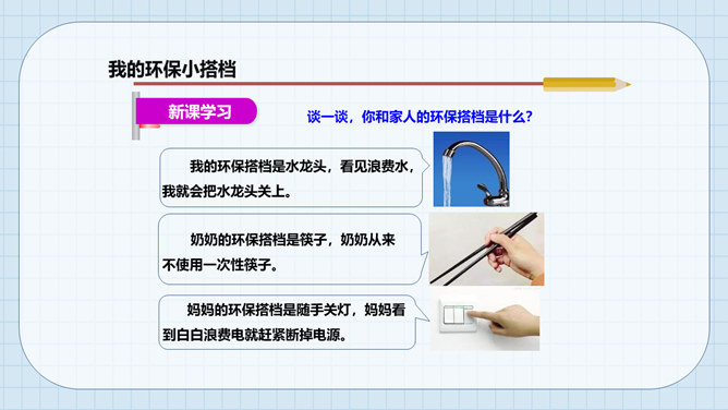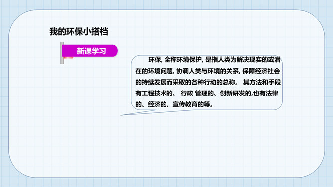 环保, 全称环境保护, 是指人类为解决现实的或潜在的环境问题, 协调人类与环境的关系, 保障经济社会的持续发展而采取的各种行动的总称。 其方法和手段有工程技术的、 行政 管理的、创新研发的,也有法律的、经济的、宣传教育的等。环保就是保护环境。环保就是节约用水。环保就是节约用纸。同学们在家里有没有环保搭档呢?家里人有没有环保搭档呢?大家都可以说一说。我的环保搭档是水龙头,看见浪费水,我就会把水龙头关上。奶奶的环保搭档是筷子,奶奶从来不使用一次性筷子。所属专题:我的环保小搭档ppt。
