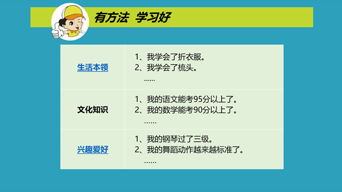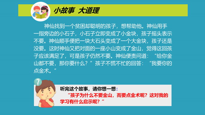 神仙找到一个贫困却聪明的孩子,想帮助他。神仙用手一指旁边的小石子,小石子立即变成了小金块,孩子摇头表示不要。神仙顺手便把一块大石头变成了一个大金块,孩子还是没要。这时神仙又把对面的一座小山变成了金山,觉得这回孩子应该满足了,可是孩子仍然不要。神仙便责问道:“给你金山都不要,那你要什么?”孩子不慌不忙的回答:“我要你的点金术。”听完这个故事,请你想一想:“孩子为什么不要金山,而要点金术呢?这对我的学习有什么启示呢?”学习必须靠自己的勤奋和努力。所属专题:学习有方法ppt。