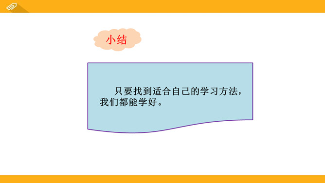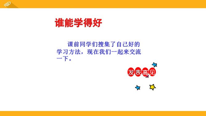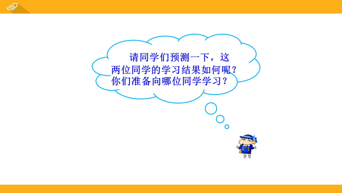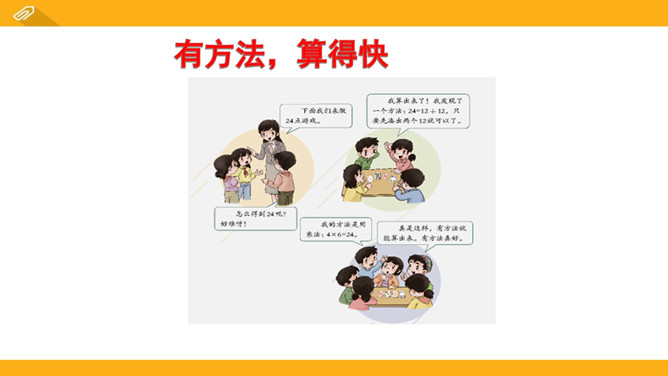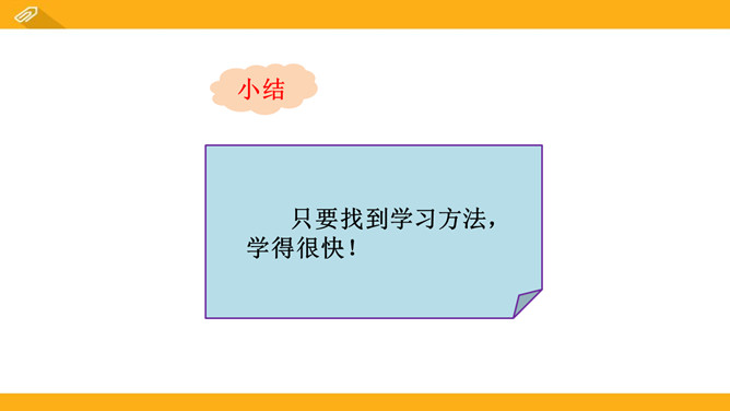 我们来做24点游戏。你们知道怎么得到24吗?只要找到学习方法,学得很快!课前同学们搜集了自己好的学习方法,现在我们一起来交流一下。请同学们预测一下,这两位同学的学习结果如何呢?你们准备向哪位同学学习?我们要养成良好的学习态度,找到好的学习方法,相信自己一定能学好。只要找到适合自己的学习方法,我们都能学好。分享方法很重要,关键是我们要做到互相帮助,共同学习,一起进步!我们认识到要找到适合自己的学习方法,互相帮助,分享自己认为好的学习方法,共同进步!所属专题:学习有方法ppt。