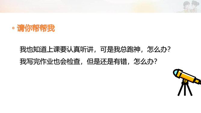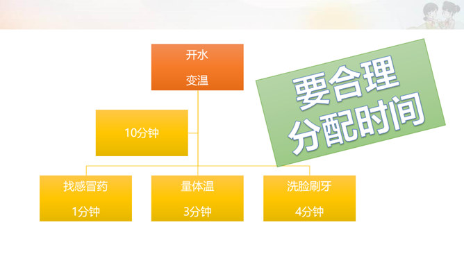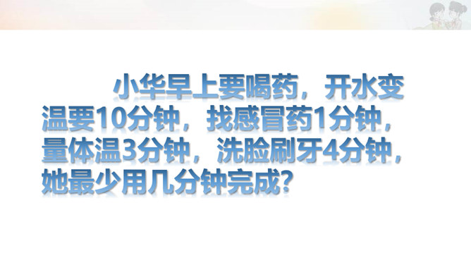 我来出提示,你来说方法。温故而知新。一寸光阴一寸金,寸金难买寸光阴。小华早上要喝药,开水变温要10分钟,找感冒药1分钟,量体温3分钟,洗脸刷牙4分钟,她最少用几分钟完成?我也知道上课要认真听讲,可是我总跑神,怎么办?我写完作业也会检查,但是还是有错,怎么办?所属专题:学习有方法ppt。