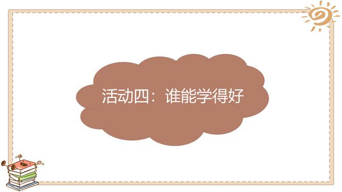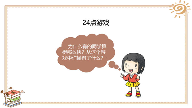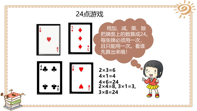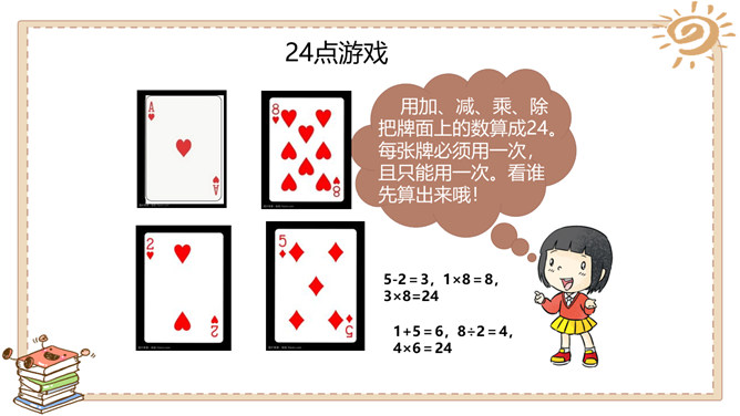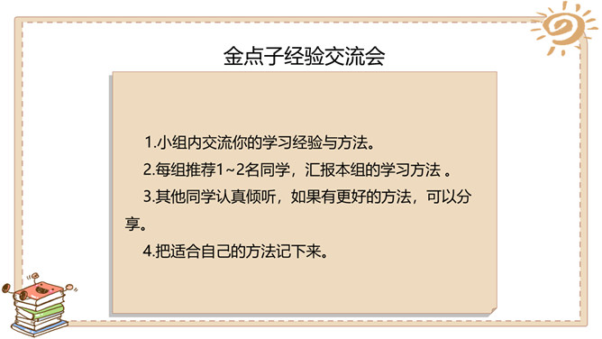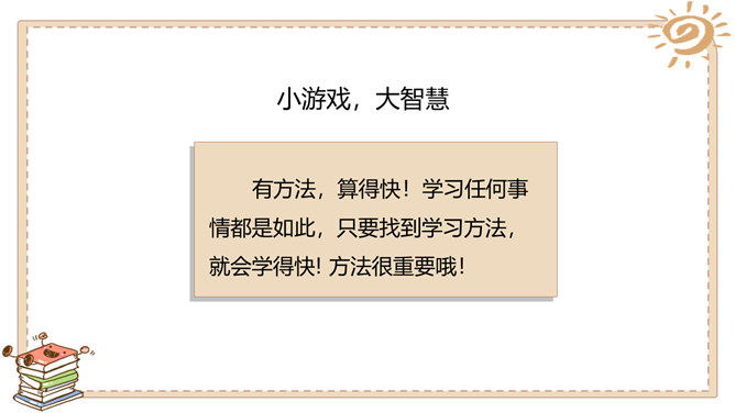 一分钟能做什么?用加、减、乘、除把牌面上的数算成24。每张牌必须用一次,且只能用一次。看谁先算出来哦!为什么有的同学算得那么快?从这个游戏中你懂得了什么?有方法,算得快!学习任何事情都是如此,只要找到学习方法,就会学得快! 方法很重要哦!金点子经验交流会:1.小组内交流你的学习经验与方法。2.每组推荐1~2名同学,汇报本组的学习方法 。3.其他同学认真倾听,如果有更好的方法,可以分享。4.把适合自己的方法记下来。所属专题:学习有方法ppt。