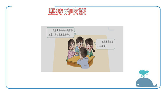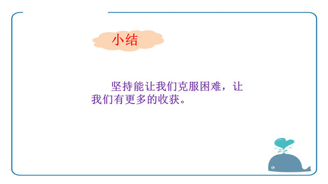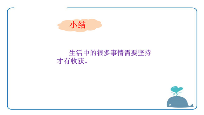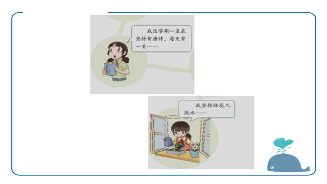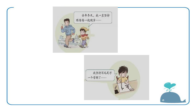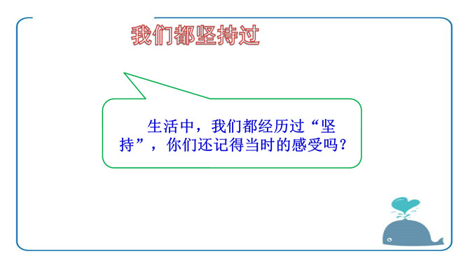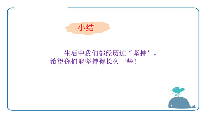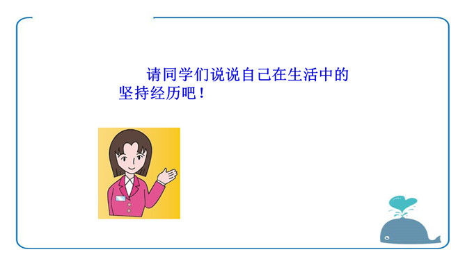 生活中,我们都经历过“坚持”,你们还记得当时的感受吗?请同学们说说自己在生活中的坚持经历吧!请同学们说说自己在生活中的坚持经历吧!生活中我们都经历过“坚持”,希望你们能坚持得长久一些!看完这两组情境图片,你们有什么感想?坚持能让我们克服困难,让我们有更多的收获。同学们,你们认为自己应该向谁学习?生活中的很多事情需要坚持才有收获。我们都曾经经历过“坚持”,虽然过程很艰辛,但是坚持过后就是胜利。因此,只要我们敢于一次次挑战自己、战胜自己,就能克服困难,有更多的收获。所属专题:坚持才会有收获ppt。
