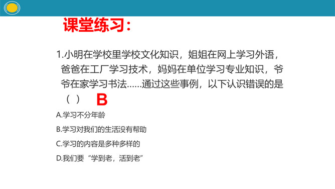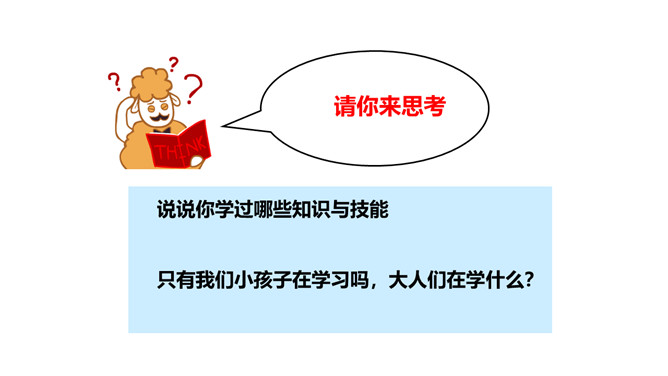 我们在学校学习。上午第一节课,语文老师带我们学习汉字。上午第三节课,我们在美术课上学习画画。8:00——9:30参观科技馆和历史博物馆。请你来思考:说说你学过哪些知识与技能只有我们小孩子在学习吗,大人们在学什么?学习永远不晚 —— 高尔基。只要愿意学习,就一定能够学会—— 列宁。小明在学校里学校文化知识,姐姐在网上学习外语,爸爸在工厂学习技术,妈妈在单位学习专业知识,爷爷在家学习书法……通过这些事例,以下认识错误的是?所属专题:学习伴我成长ppt。