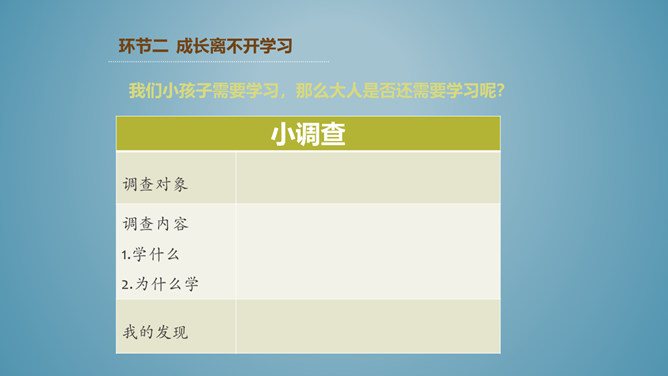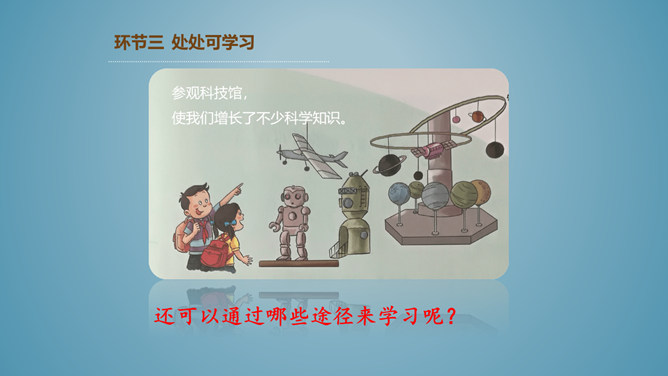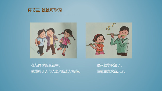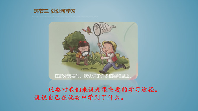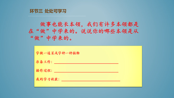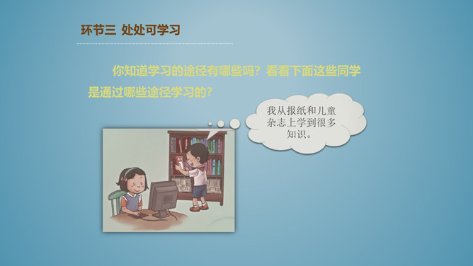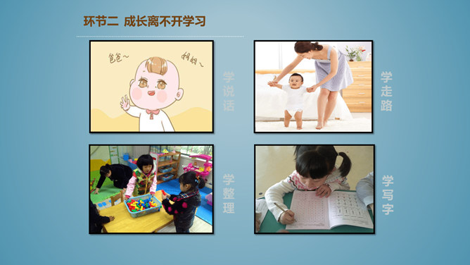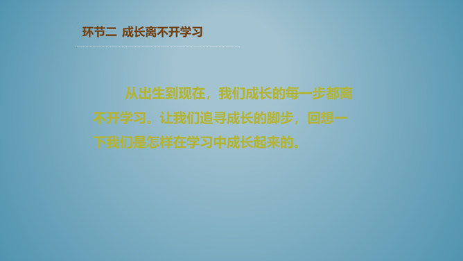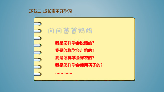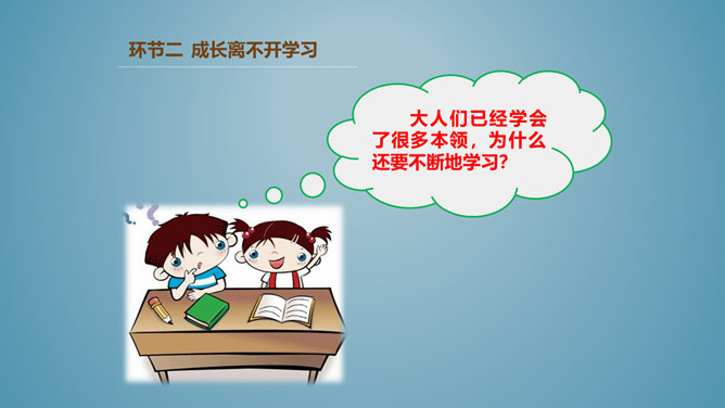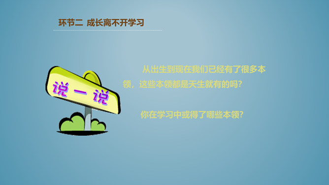 从出生到现在,我们成长的每一步都离不开学习。让我们追寻成长的脚步,回想一下我们是怎样在学习中成长起来的。问问爸爸妈妈:我是怎样学会说话的?我是怎样学会走路的?我是怎样学会穿衣的?我是怎样学会使用筷子的?从出生到现在我们已经有了很多本领,这些本领都是天生就有的吗?你在学习中或得了哪些本领?我们小孩子需要学习,那么大人是否还需要学习呢?大人们已经学会了很多本领,为什么还要不断地学习? 你知道学习的途径有哪些吗?看看下面这些同学是通过哪些途径学习的?所属专题:学习伴我成长ppt。
