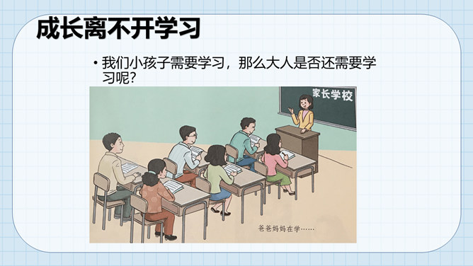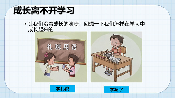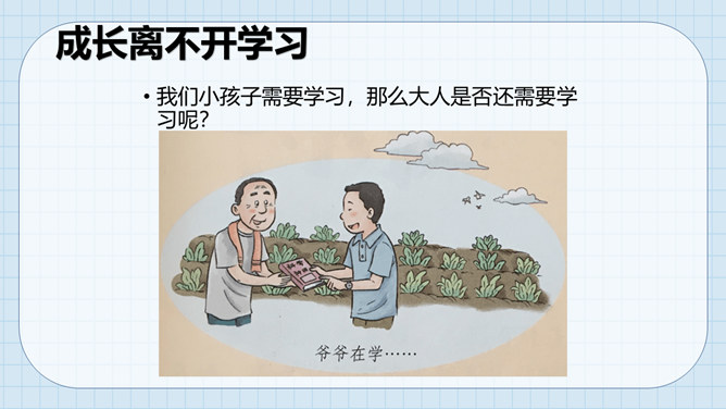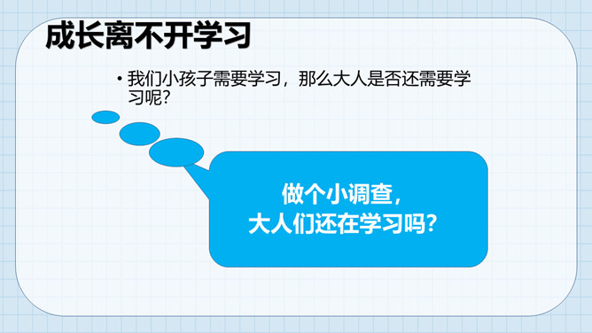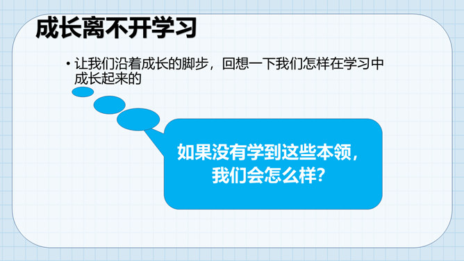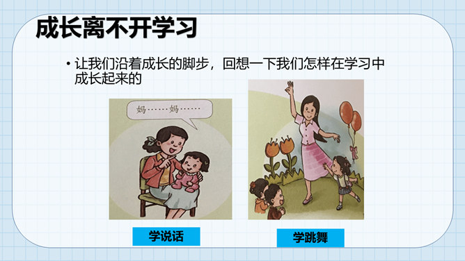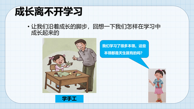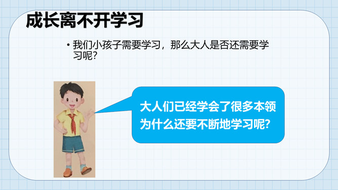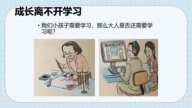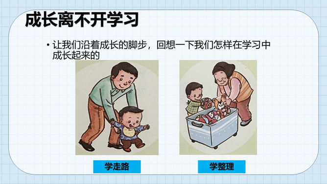 让我们沿着成长的脚步,回想一下我们怎样在学习中成长起来的。我们学习了很多本领。这些本领都是天生就有的吗?如果没有学到这些本领,我们会怎么样?我们小孩子需要学习,那么大人是否还需要学习呢?做个小调查,大人们还在学习吗?大人们已经学会了很多本领为什么还要不断地学习呢?所属专题:学习伴我成长ppt。