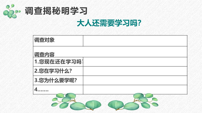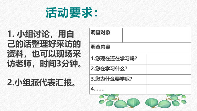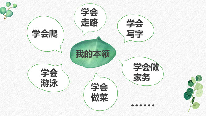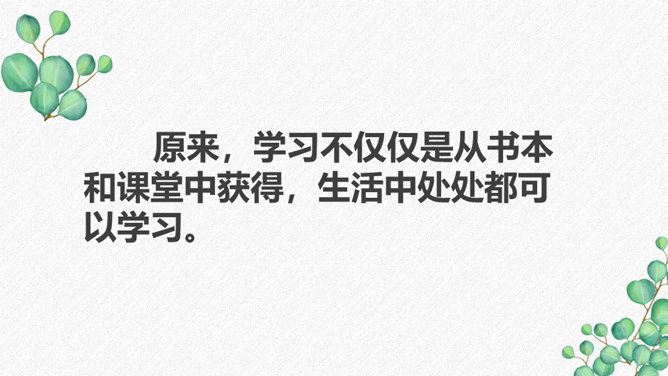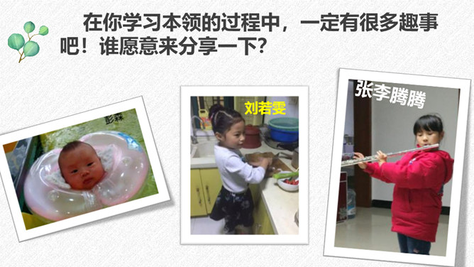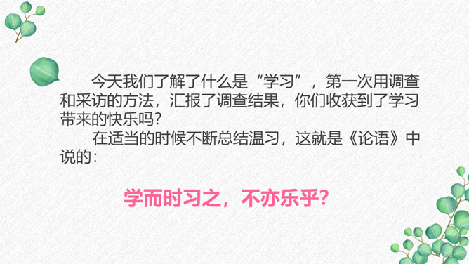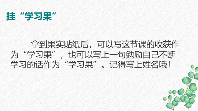 在你学习本领的过程中,一定有很多趣事吧!谁愿意来分享一下?原来,学习不仅仅是从书本和课堂中获得,生活中处处都可以学习。今天我们了解了什么是“学习”,第一次用调查和采访的方法,汇报了调查结果,你们收获到了学习带来的快乐吗?在适当的时候不断总结温习,这就是《论语》中说的:学而时习之,不亦乐乎?挂“学习果”:拿到果实贴纸后,可以写这节课的收获作为“学习果”,也可以写上一句勉励自己不断学习的话作为“学习果”。记得写上姓名哦!所属专题:学习伴我成长ppt。
