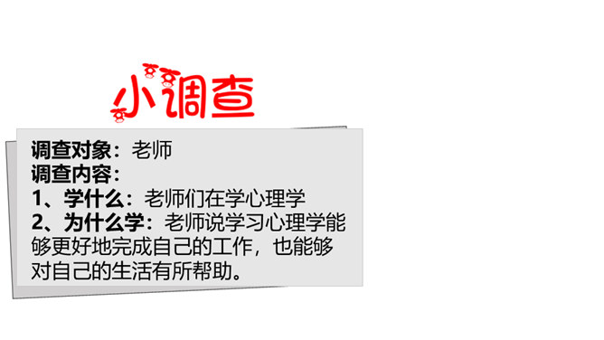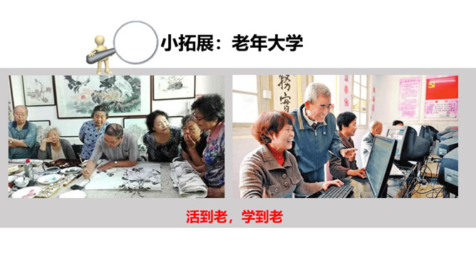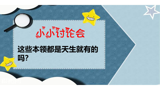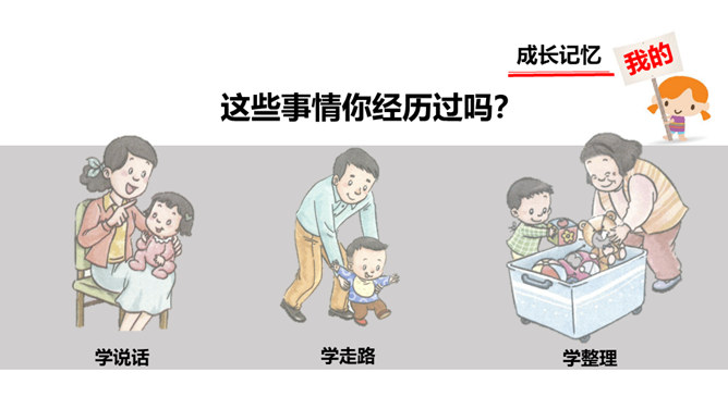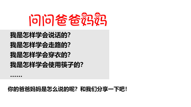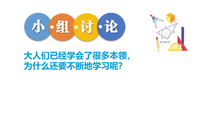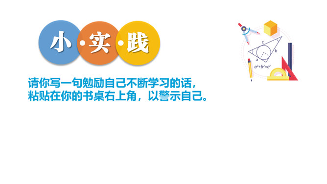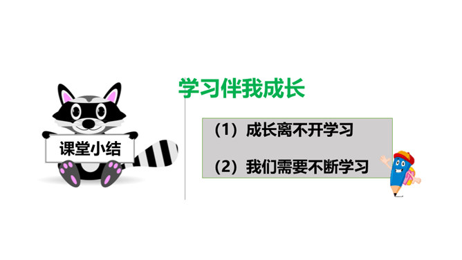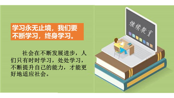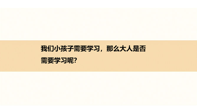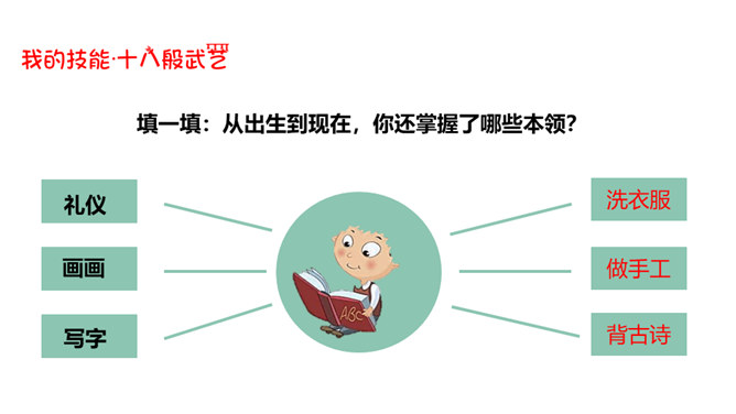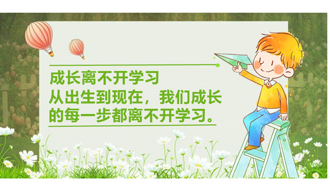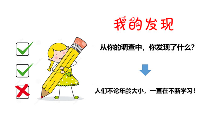 填一填:从出生到现在,你还掌握了哪些本领?这些本领都是天生就有的吗?成长离不开学习,从出生到现在,我们成长的每一步都离不开学习。我们小孩子需要学习,那么大人是否需要学习呢?从你的调查中,你发现了什么?人们不论年龄大小,一直在不断学习!大人们已经学会了很多本领,为什么还要不断地学习呢?社会在不断发展进步,人们只有时时学习,处处学习,不断提升自己的能力,才能更好地适应社会。请你写一句勉励自己不断学习的话,粘贴在你的书桌右上角,以警示自己。所属专题:学习伴我成长ppt。