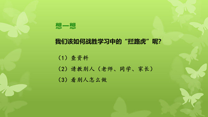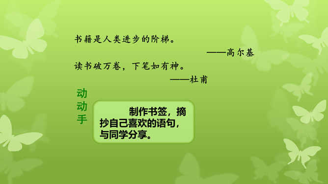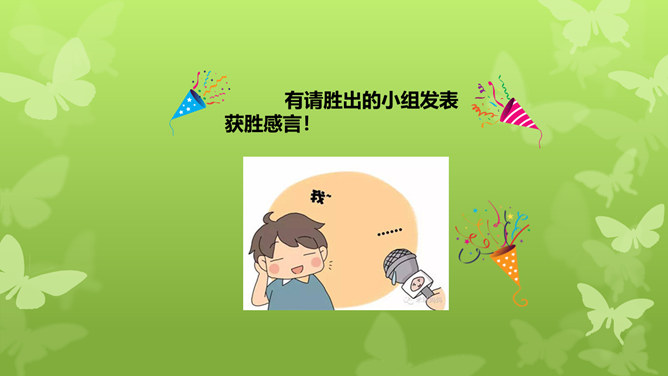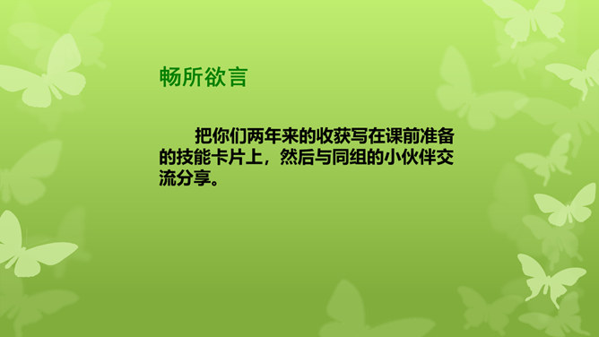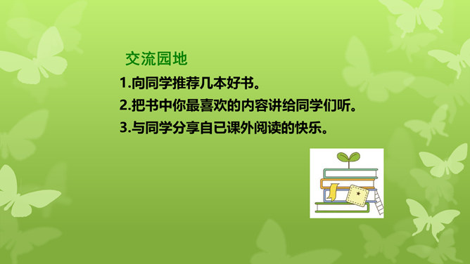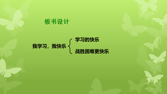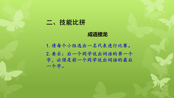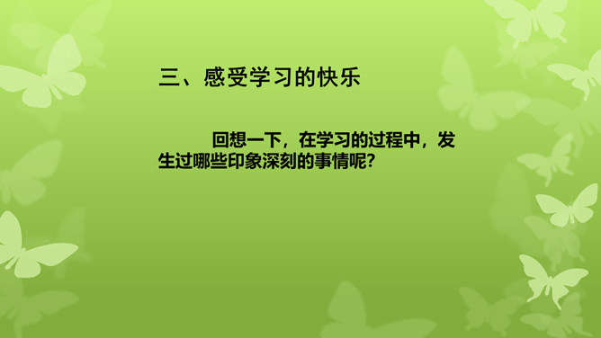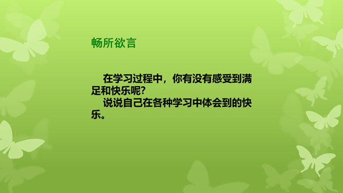 把你们两年来的收获写在课前准备的技能卡片上,然后与同组的小伙伴交流分享。成语接龙:1.请每个小组选出一名代表进行比赛。2.要求:后一个同学说出词语的第一个字,必须是前一个同学说出词语的最后一个字。有请胜出的小组发表获胜感言!回想一下,在学习的过程中,发生过哪些印象深刻的事情呢?在学习过程中,你有没有感受到满足和快乐呢?说说自己在各种学习中体会到的快乐。向同学推荐几本好书。把书中你最喜欢的内容讲给同学们听。与同学分享自已课外阅读的快乐。所属专题:我学习我快乐ppt。