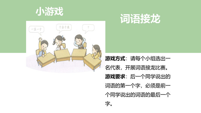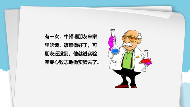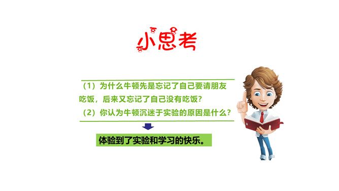 牛顿是世界著名的大科学家。有一次,牛顿请朋友来家里吃饭,饭菜做好了,可朋友还没到,他就进实验室专心致志地做实验去了。朋友来后找不着牛顿,因急于上班,就独个儿把饭菜吃了,并把吃剩的鸡骨头放在盒子里,然后走了。(1)为什么牛顿先是忘记了自己要请朋友吃饭,后来又忘记了自己没有吃饭?(2)你认为牛顿沉迷于实验的原因是什么?体验到了实验和学习的快乐。游戏方式:请每个小组选出一名代表,开展词语接龙比赛。游戏要求:后一个同学说出的词语的第一个字,必须是前一个同学说出的词语的最后一个字。所属专题:我学习我快乐ppt。