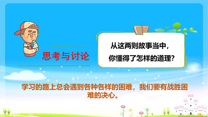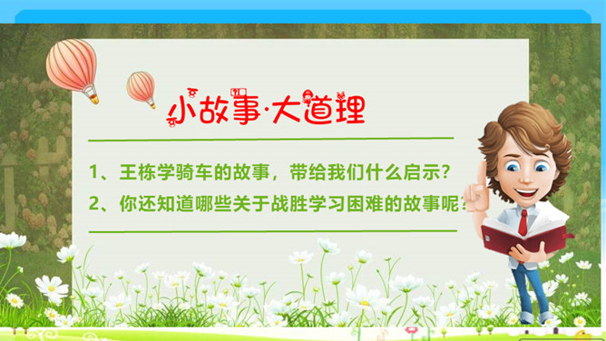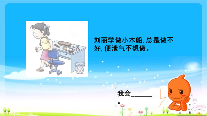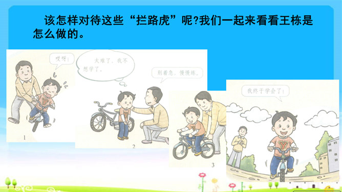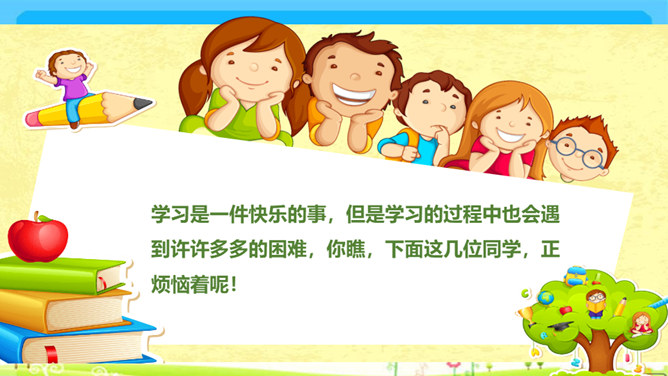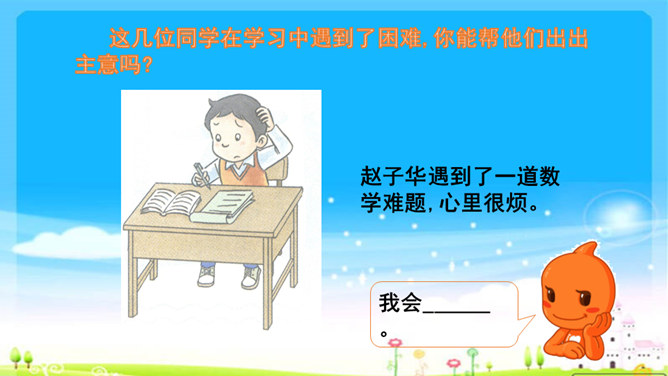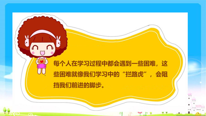 你遇到过困难吗?学习是一件快乐的事,但是学习的过程中也会遇到许许多多的困难,你瞧,下面这几位同学,正烦恼着呢!这几位同学在学习中遇到了困难,你能帮他们出出主意吗?赵子华遇到了一道数学难题,心里很烦。刘丽学做小木船,总是做不好,便泄气不想做。孙田总是记不住英语单词,发音也不准确。每个人在学习过程中都会遇到一些困难,这些困难就像我们学习中的“拦路虎”,会阻挡我们前进的脚步。该怎样对待这些“拦路虎”呢?我们一起来看看王栋是怎么做的。所属专题:我学习我快乐ppt。