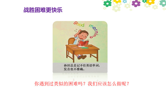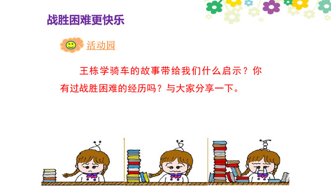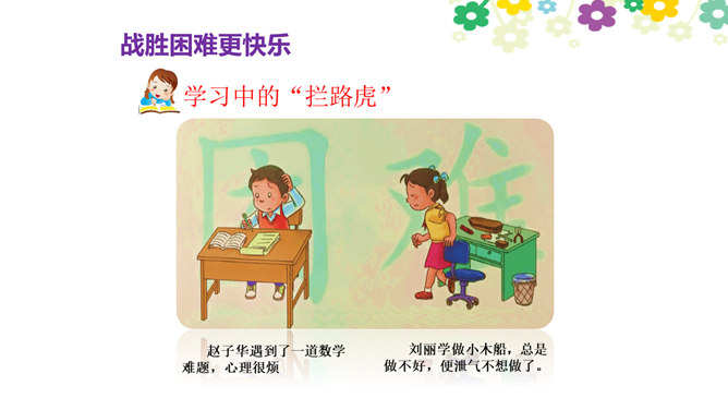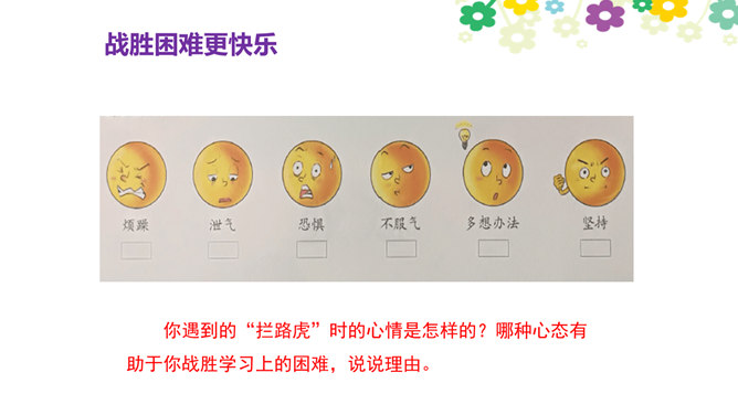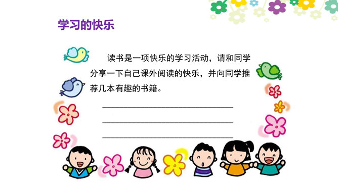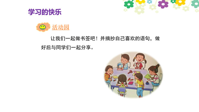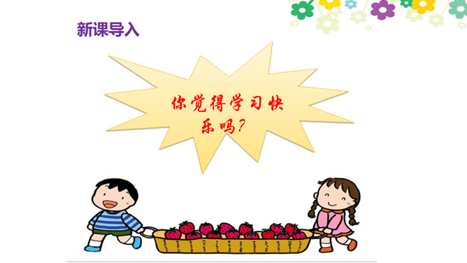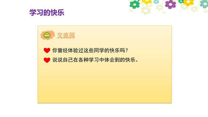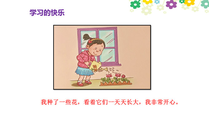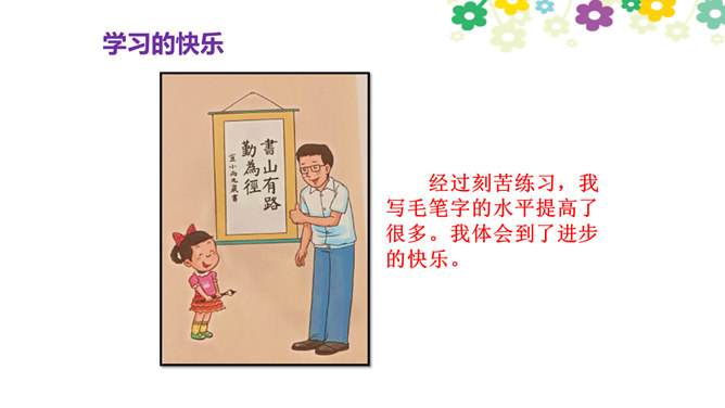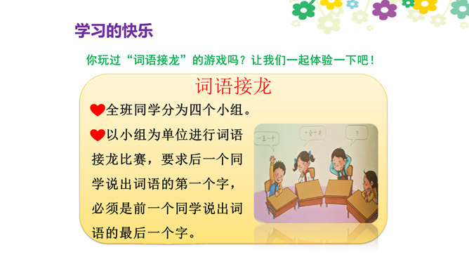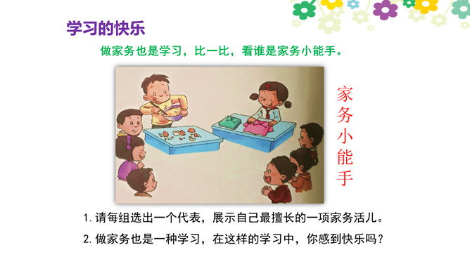 你觉得学习快乐吗?你玩过“词语接龙”的游戏吗?让我们一起体验一下吧!做家务也是学习,比一比,看谁是家务小能手。请每组选出一个代表,展示自己最擅长的一项家务活儿。做家务也是一种学习,在这样的学习中,你感到快乐吗?我喜欢下中国象棋,从中感受到许多快乐。我种了一些花,看着它们一天天长大,我非常开心。经过刻苦练习,我写毛笔字的水平提高了很多。我体会到了进步的快乐。你曾经体验过这些同学的快乐吗?说说自己在各种学习中体会到的快乐。所属专题:我学习我快乐ppt。
