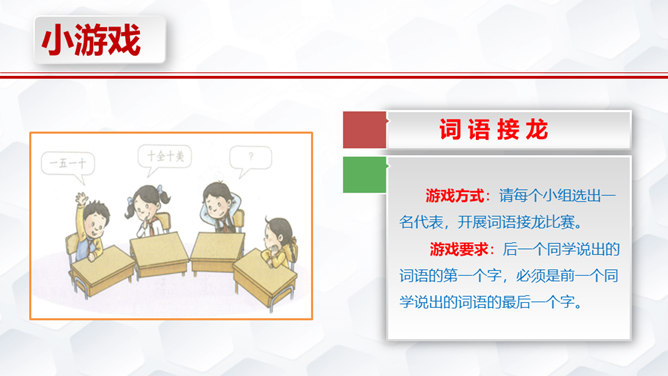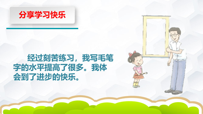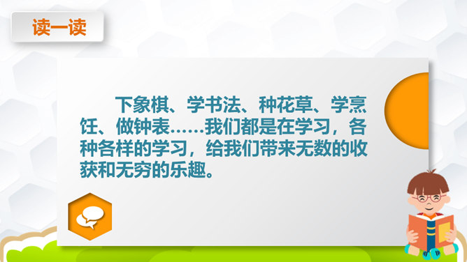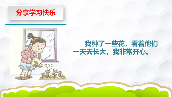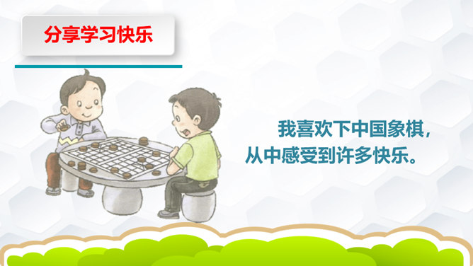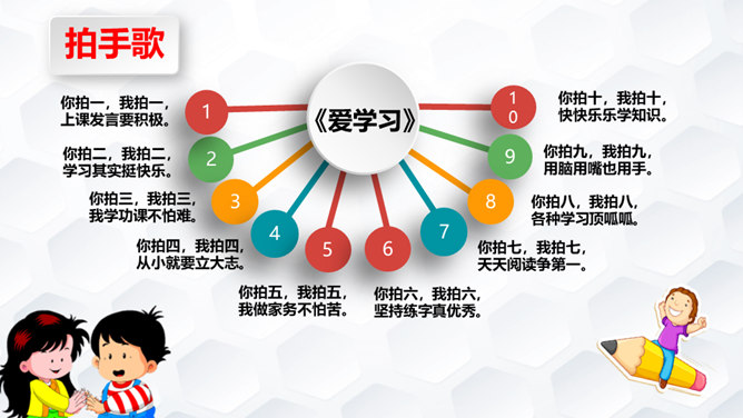 下象棋、学书法、种花草、学烹饪、做钟表……我们都是在学习,各种各样的学习,给我们带来无数的收获和无穷的乐趣。你拍一,我拍一,上课发言要积极。你拍二,我拍二,学习其实挺快乐。你拍三,我拍三,我学功课不怕难。你拍四,我拍四,从小就要立大志。你拍五,我拍五,我做家务不怕苦。你拍六,我拍六,坚持练字真优秀。你拍七,我拍七,天天阅读争第一。你拍八,我拍八,各种学习顶呱呱。你拍九,我拍九,用脑用嘴也用手。 你拍十,我拍十,快快乐乐学知识。所属专题:我学习我快乐ppt。