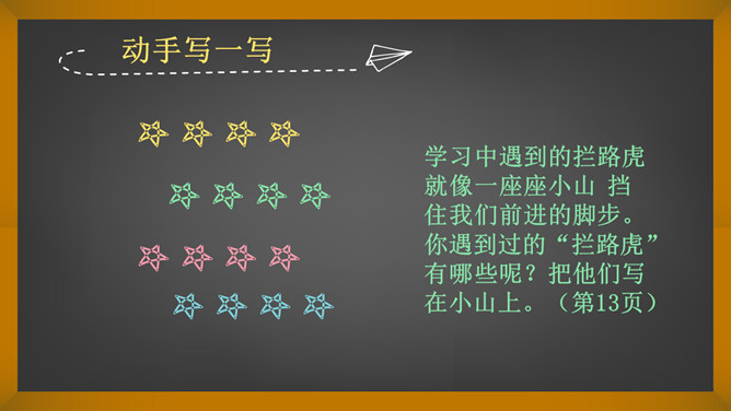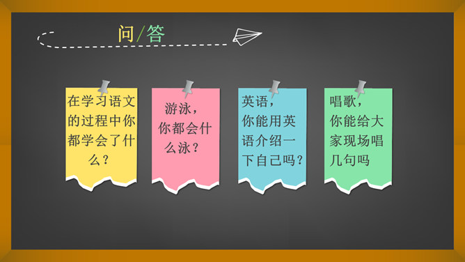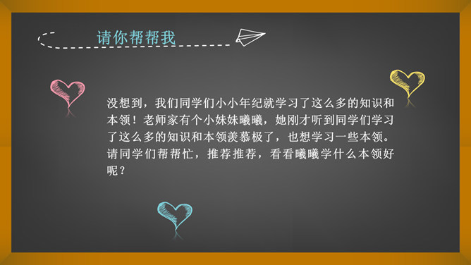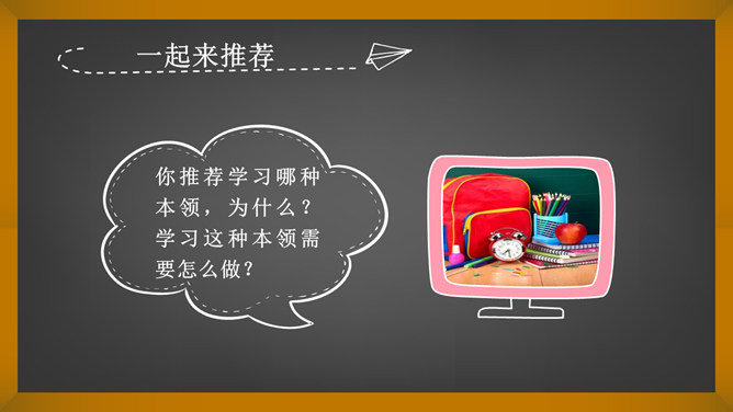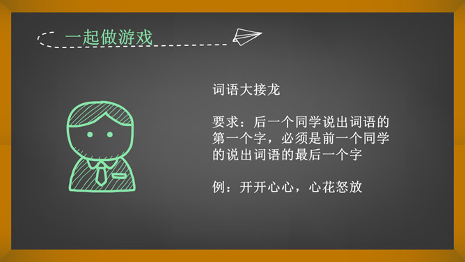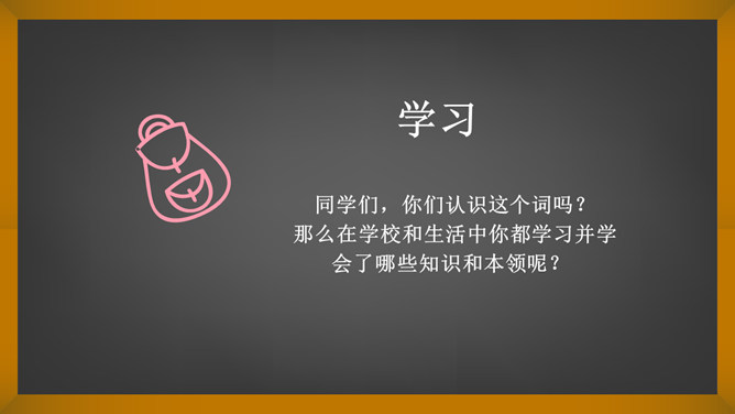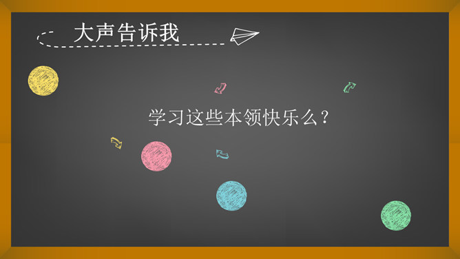 词语大接龙。要求:后一个同学说出词语的第一个字,必须是前一个同学的说出词语的最后一个字。例:开开心心,心花怒放。同学们,你们认识这个词吗?那么在学校和生活中你都学习并学会了哪些知识和本领呢? 语文、数学、英语、美术、骑车、游泳、口才、做饭、叠衣服、扫地……在学习语文的过程中你都学会了什么?游泳,你都会什么泳?英语,你能用英语介绍一下自己吗?唱歌,你能给大家现场唱几句吗?学习这些本领快乐么?没想到,我们同学们小小年纪就学习了这么多的知识和本领!所属专题:我学习我快乐ppt。