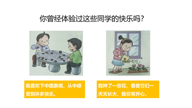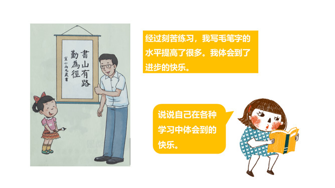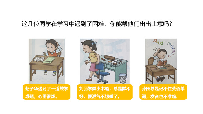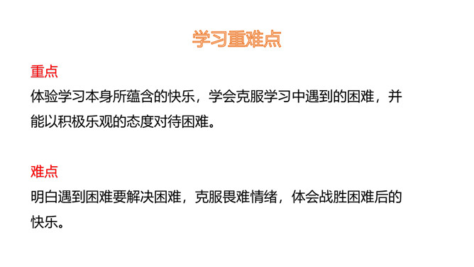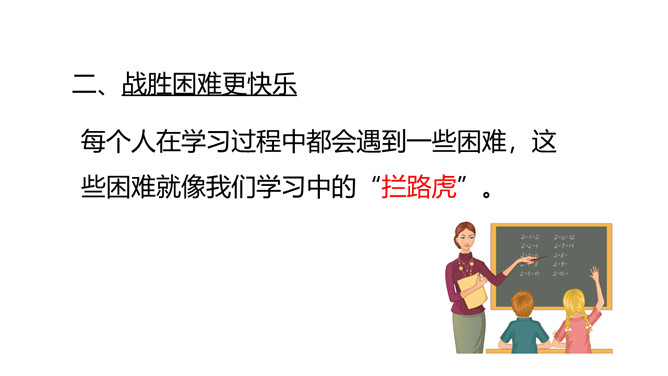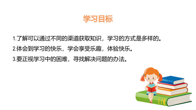 1.了解可以通过不同的渠道获取知识,学习的方式是多样的。2.体会到学习的快乐,学会享受乐趣,体验快乐。3.要正视学习中的困难,寻找解决问题的办法。体验学习本身所蕴含的快乐,学会克服学习中遇到的困难,并能以积极乐观的态度对待困难。明白遇到困难要解决困难,克服畏难情绪,体会战胜困难后的快乐。好书很吸引人,读书也是一种快乐的学习活动。你有过战胜困难的经历吗?与大家分享一下。你遇到过的“拦路虎”有哪些呢?没有恒心和毅力、注意力不集中、容易分心。所属专题:我学习我快乐ppt。