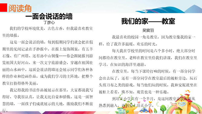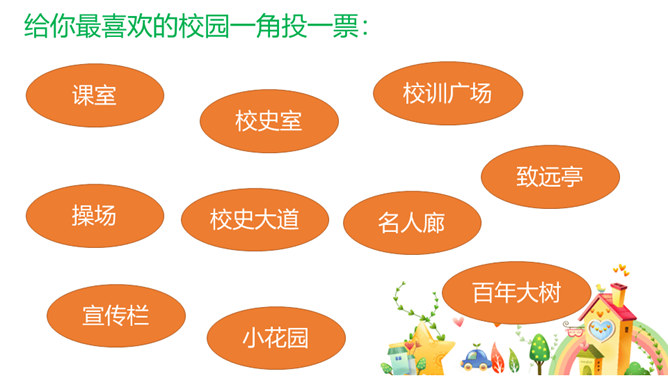 我最喜欢的校园一角,给你最喜欢的校园一角投一票。我最喜欢的校园一角是教室,因为教室像我的家一样,给了我许多温暖、欢乐的时光。每天我在学校里的时间是六个多小时,绝大部分时间都待在教室里。老师在教室里给我们讲课,我们在教室里学习,在知识的海洋里遨游。在教室里,每当下课铃打响的时候,有一部分同学会出去玩了,还有一部分同学在教室最后的被柜旁边,玩石头剪刀布之类的游戏。每当他们玩的时候,我和安妮就坐在被柜上看着,殊不知,观赏也是一种乐趣。所属专题:说说我们学校ppt。