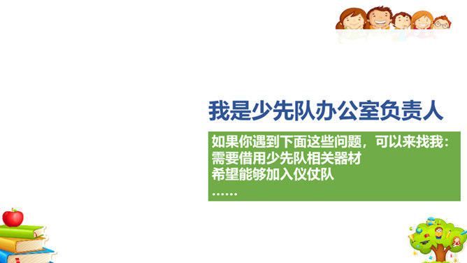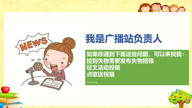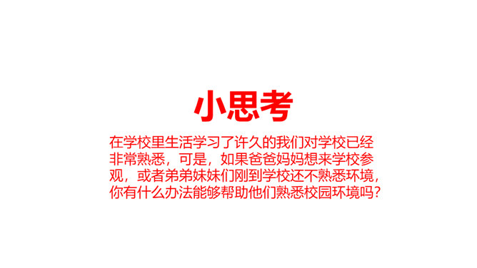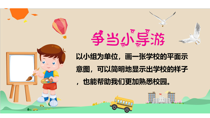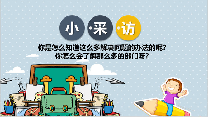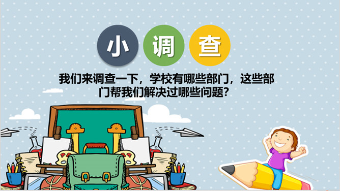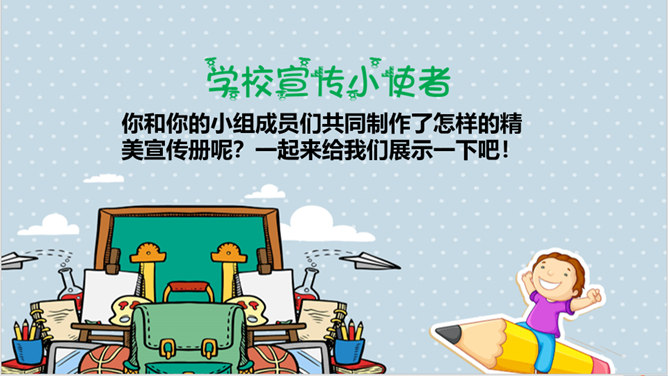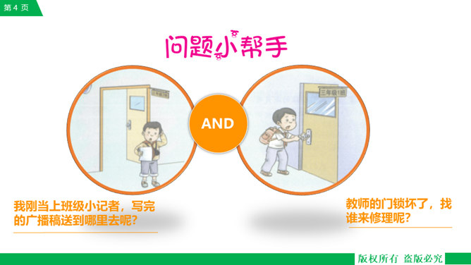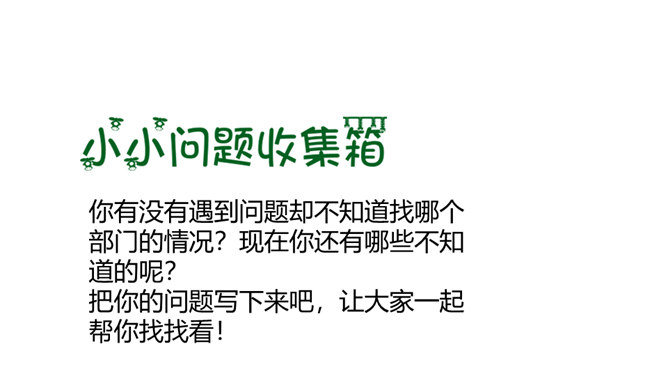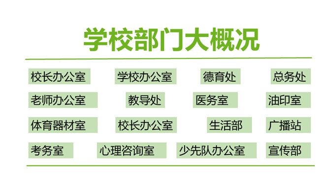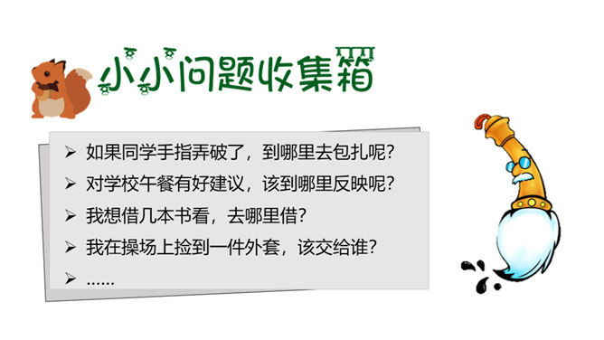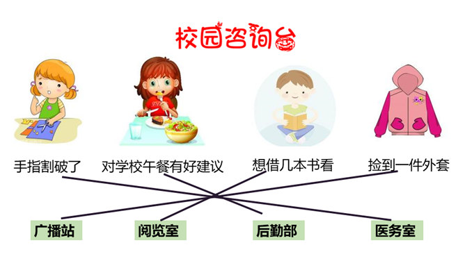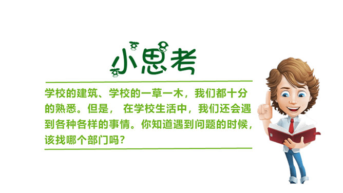 你和你的小组成员们共同制作了怎样的精美宣传册呢?一起来给我们展示一下吧!学校的建筑、学校的一草一木,我们都十分的熟悉。但是, 在学校生活中,我们还会遇到各种各样的事情。你知道遇到问题的时候,该找哪个部门吗?我刚当上班级小记者,写完的广播稿送到哪里去呢?教师的门锁坏了,找谁来修理呢?你有没有遇到问题却不知道找哪个部门的情况?现在你还有哪些不知道的呢?把你的问题写下来吧,让大家一起帮你找找看!如果同学手指弄破了,到哪里去包扎呢?对学校午餐有好建议,该到哪里反映呢?所属专题:说说我们学校ppt。