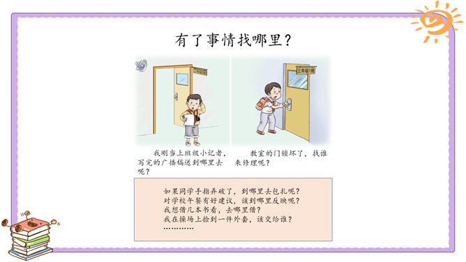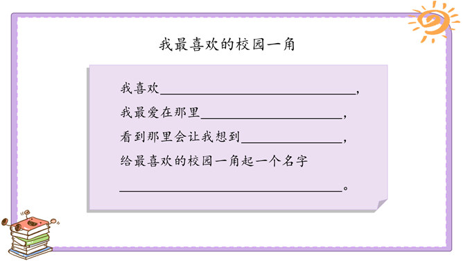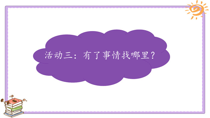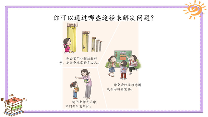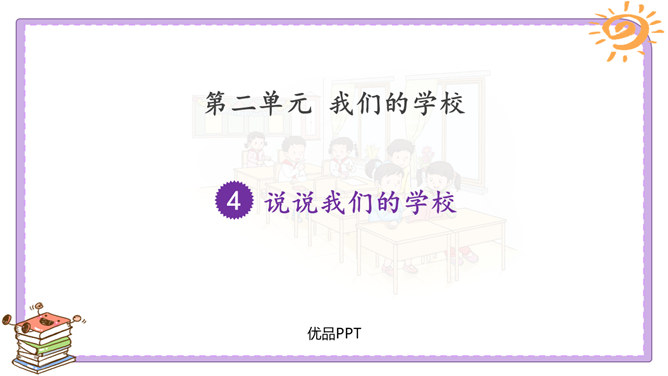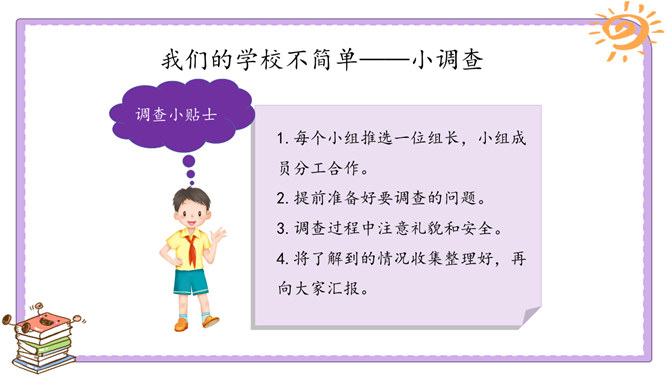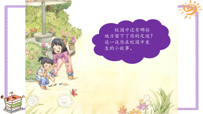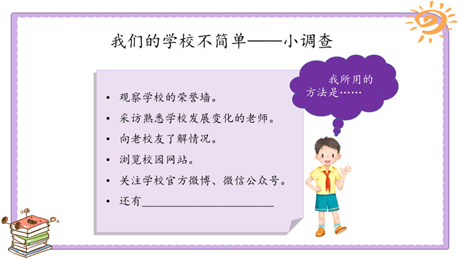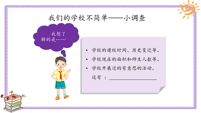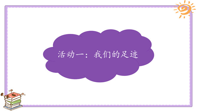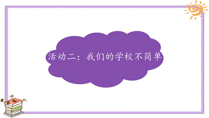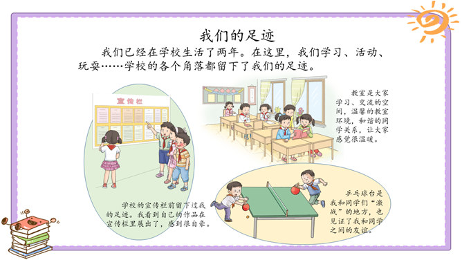 活动一:我们的足迹。我们已经在学校生活了两年。在这里,我们学习、活动、玩耍……学校的各个角落都留下了我们的足迹。学校的宣传栏前留下过我的足迹。我看到自己的作品在宣传栏里展出了,感到很自豪。教室是大家学习、交流的空间,温馨的教室环境,和谐的同学关系,让大家感觉很温暖。乒乓球台是我和同学们“激战”的地方,也见证了我和同学之间的友谊。校园中还有哪些地方留下了你的足迹?说一说你在校园中发生的小故事。活动二:我们的学校不简单。观察学校的荣誉墙。采访熟悉学校发展变化的老师。所属专题:说说我们学校ppt。