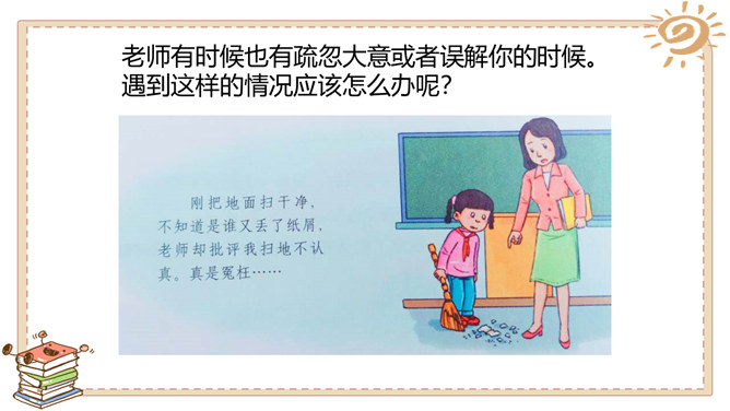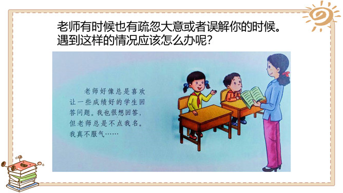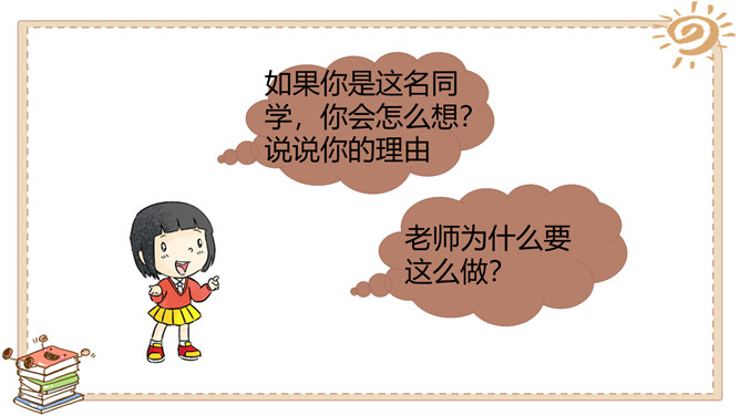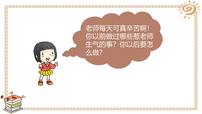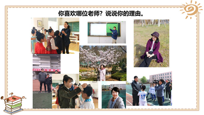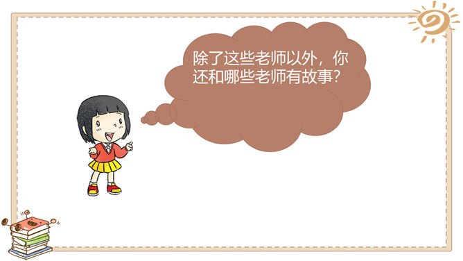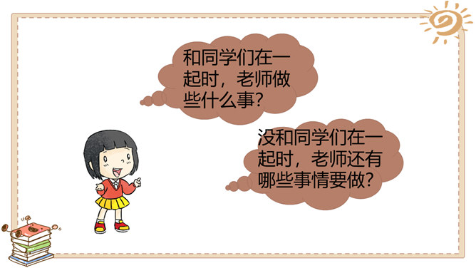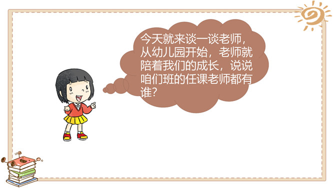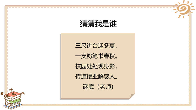 猜猜我是谁:三尺讲台迎冬夏,一支粉笔书春秋。校园处处现身影,传道授业解惑人。谜底(老师)今天就来谈一谈老师,从幼儿园开始,老师就陪着我们的成长,说说咱们班的任课老师都有谁?你喜欢哪位老师?说说你的理由。除了这些老师以外,你还和哪些老师有故事?如果你是这名同学,你会怎么想?说说你的理由。老师为什么要这么做?老师有时候也有疏忽大意或者误解你的时候。遇到这样的情况应该怎么办呢?和同学们在一起时,老师做些什么事?没和同学们在一起时,老师还有哪些事情要做?所属专题:走近我们的老师ppt。