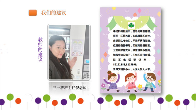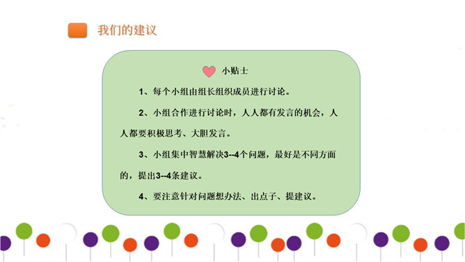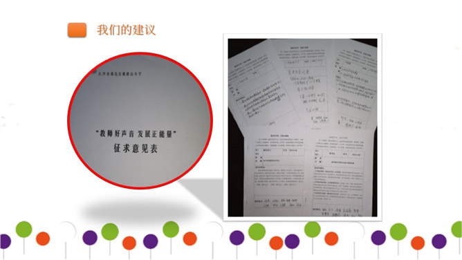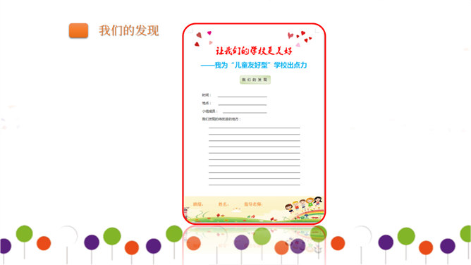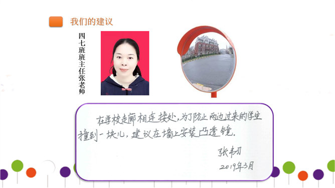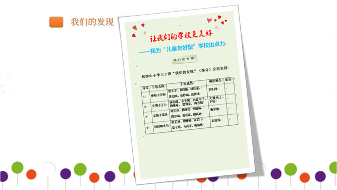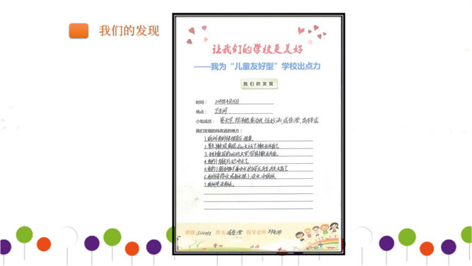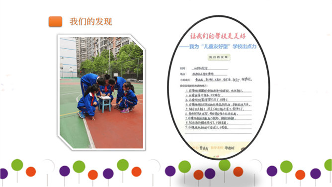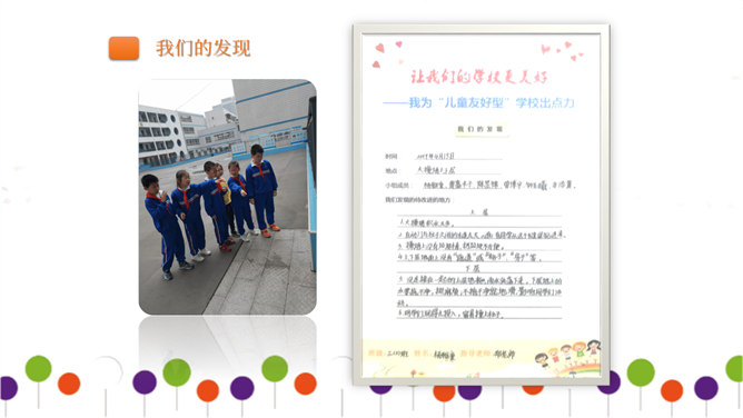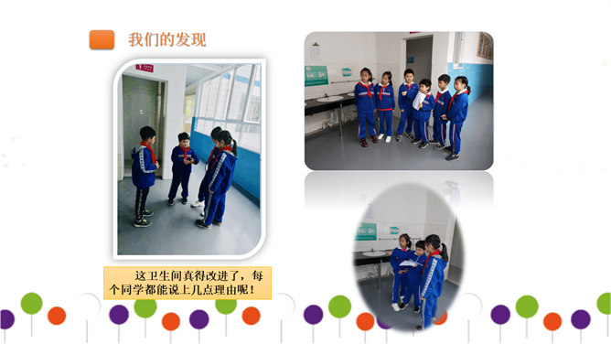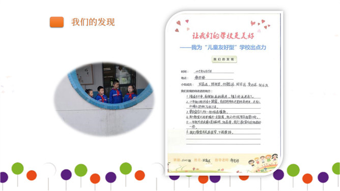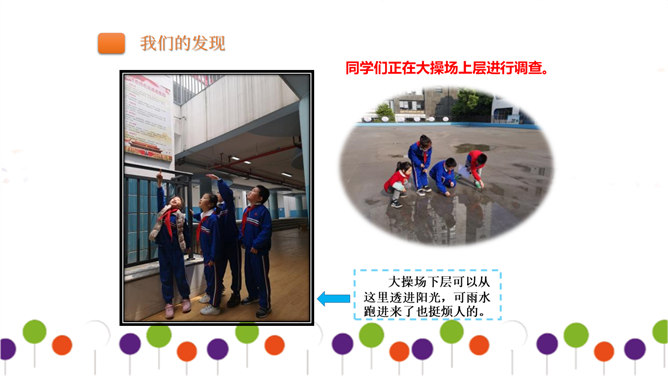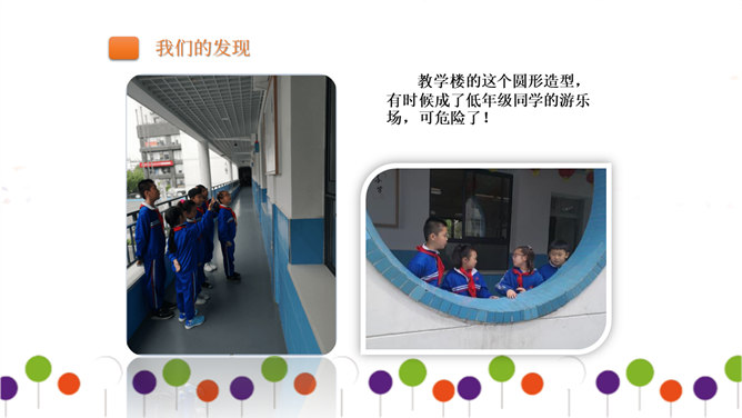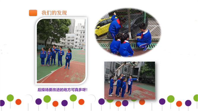 同学们正在大操场上层进行调查。大操场下层可以从这里透进阳光,可雨水跑进来了也挺烦人的。教学楼的这个圆形造型,有时候成了低年级同学的游乐场,可危险了!1、每个小组由组长组织成员进行讨论。2、小组合作进行讨论时,人人都有发言的机会,人人都要积极思考、大胆发言。3、小组集中智慧解决3--4个问题,最好是不同方面的,提出3--4条建议。4、要注意针对问题想办法、出点子、提建议。小组汇报一定注意以下三点:我们组所提的办法、建议是否可行。我们组上台汇报的形式好不好?小组成员上台、下台以及在台上的表现要大方。所属专题:让我们的学校更美好ppt。