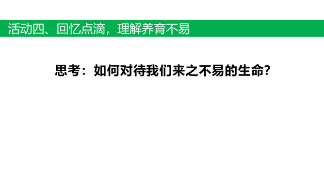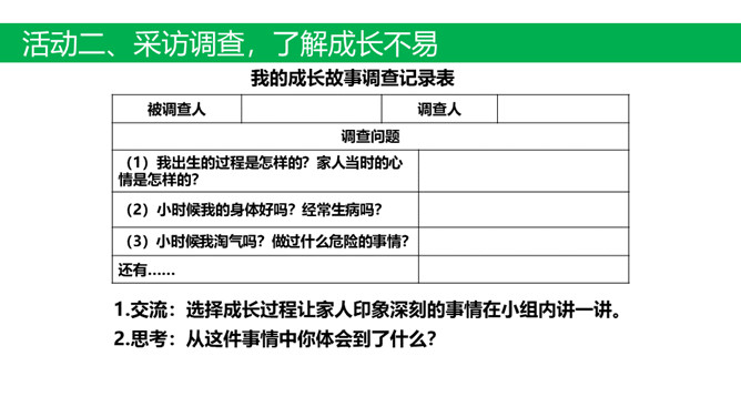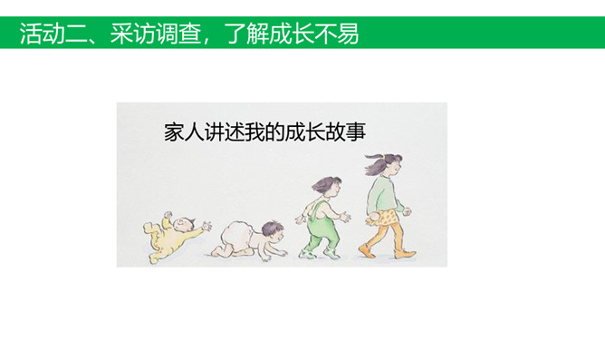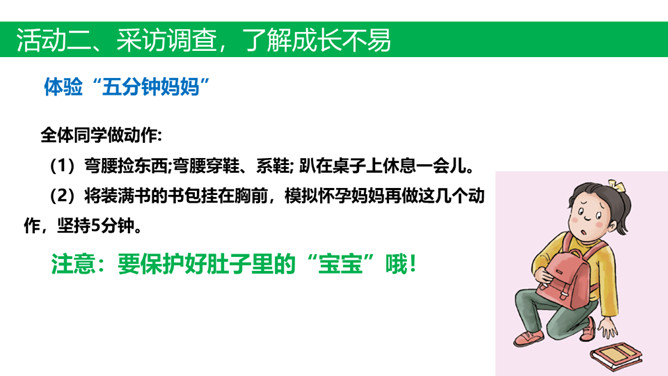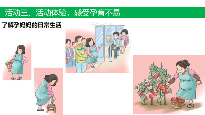活动一、创设情境 激趣引入。活动二、采访调查,了解成长不易。(1)我出生的过程是怎样的?家人当时的心情是怎样的?(2)小时候我的身体好吗?经常生病吗?(3)小时候我淘气吗?做过什么危险的事情?1.交流:选择成长过程让家人印象深刻的事情在小组内讲一讲。2.思考:从这件事情中你体会到了什么?活动三、活动体验,感受孕育不易。了解孕妈妈的日常生活。全体同学做动作:(1)弯腰捡东西;弯腰穿鞋、系鞋; 趴在桌子上休息一会儿。(2)将装满书的书包挂在胸前,模拟怀孕妈妈再做这几个动作,坚持5分钟。所属专题:生命最宝贵ppt。