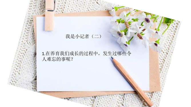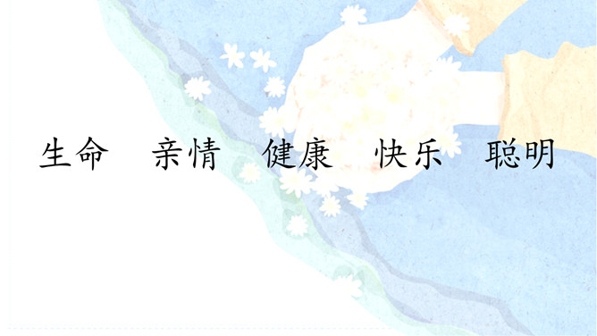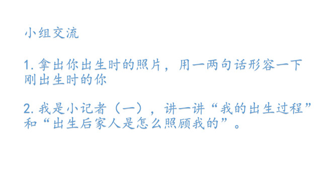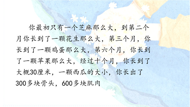 你最初只有一个芝麻那么大,到第二个月你长到了一颗花生那么大,第三个月,你长到了一颗鸡蛋那么大,第六个月,你长到了一颗苹果那么大,经过十个月,你长到了大概30厘米,一颗西瓜的大小,你长出了300多块骨头,600多块肌肉。小组交流:1.拿出你出生时的照片,用一两句话形容一下刚出生时的你。2.我是小记者,讲一讲“我的出生过程”和“出生后家人是怎么照顾我的”。在养育我们成长的过程中,发生过哪些令人难忘的事呢?所属专题:生命最宝贵ppt。