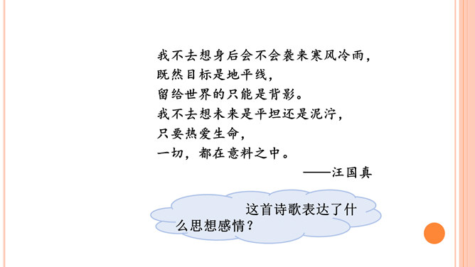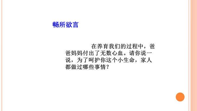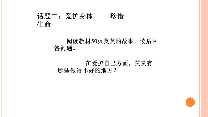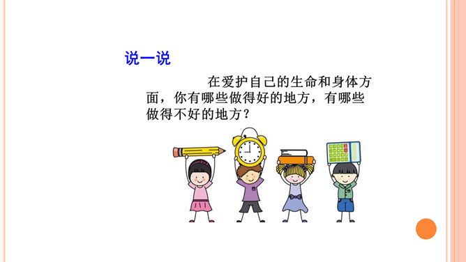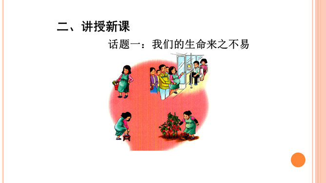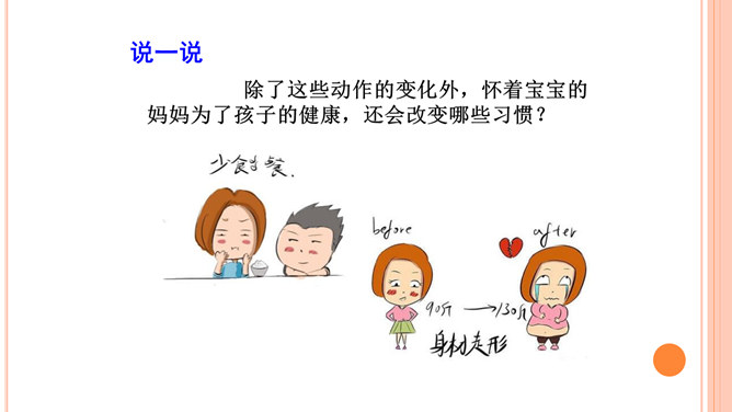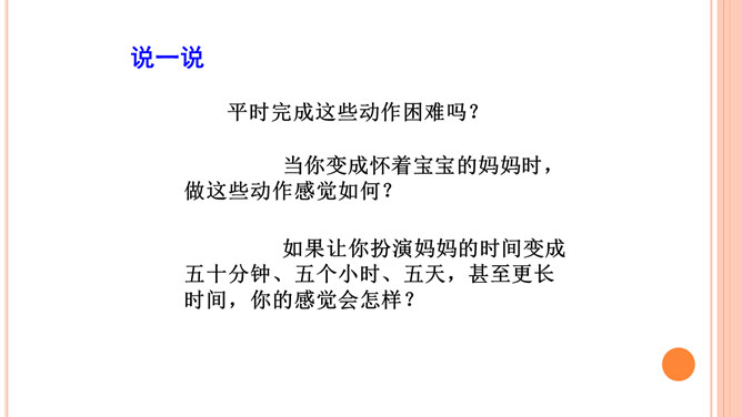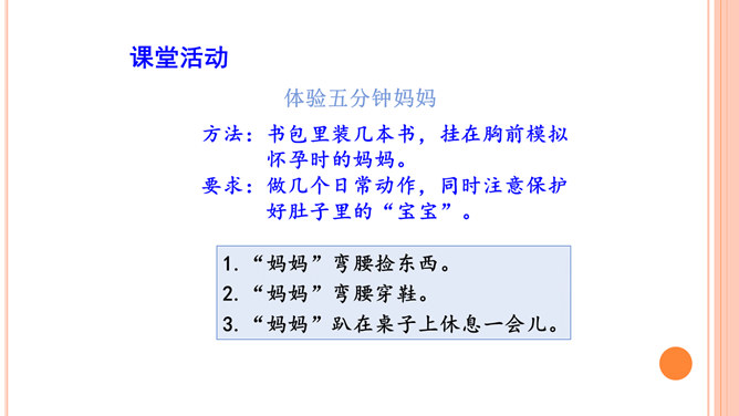 体验五分钟妈妈。方法:书包里装几本书,挂在胸前模拟怀孕时的妈妈。要求:做几个日常动作,同时注意保护好肚子里的“宝宝”。1.“妈妈”弯腰捡东西。2.“妈妈”弯腰穿鞋。3.“妈妈”趴在桌子上休息一会儿。平时完成这些动作困难吗?当你变成怀着宝宝的妈妈时,做这些动作感觉如何?如果让你扮演妈妈的时间变成五十分钟、五个小时、五天,甚至更长时间,你的感觉会怎样?除了这些动作的变化外,怀着宝宝的妈妈为了孩子的健康,还会改变哪些习惯?因为有了宝宝,妈妈还会关注哪些问题?所属专题:生命最宝贵ppt。