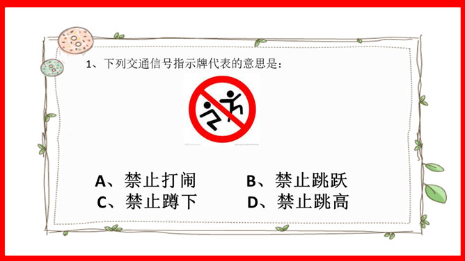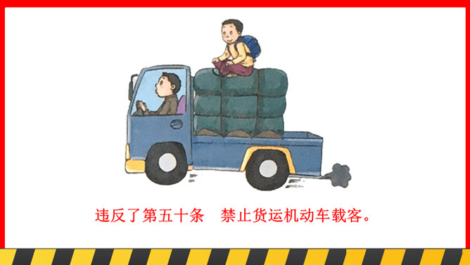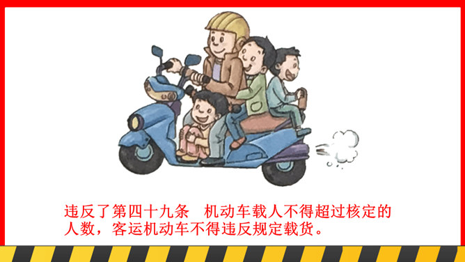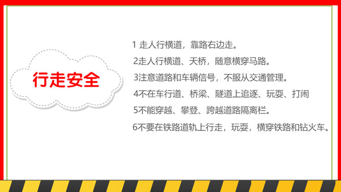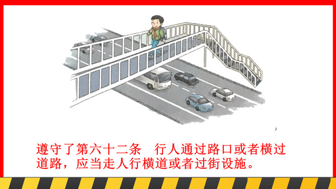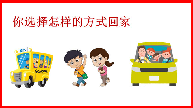 你选择怎样的方式回家。行走安全:走人行横道,靠路右边走。走人行横道、天桥,随意横穿马路。注意道路和车辆信号,不服从交通管理。不在车行道、桥梁、隧道上追逐、玩耍、打闹。不能穿越、攀登、跨越道路隔离栏。不要在铁路道轨上行走,玩耍,横穿铁路和钻火车。“生命”,一个多么鲜活的名词;“安全”,一个多么古老的话题;通过今天的学习,相信大家都能平平安安,快快乐乐回家。机动车载人不得超过核定的人数,客运机动车不得违反规定载货。所属专题:安全记心上ppt。