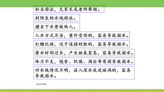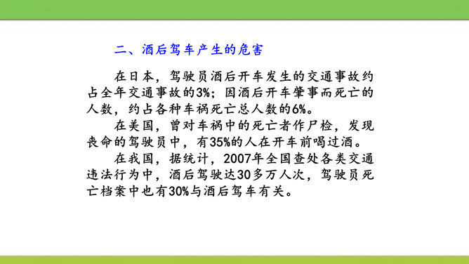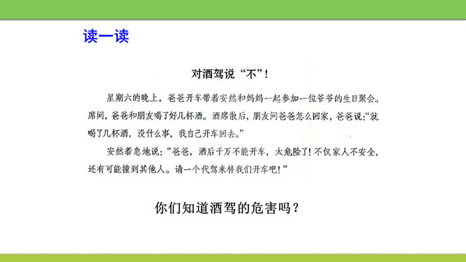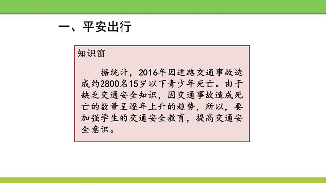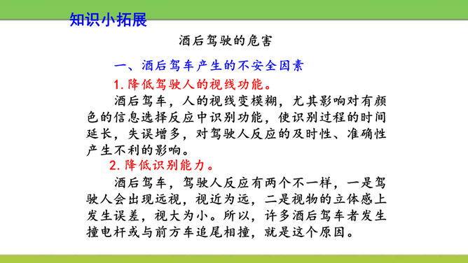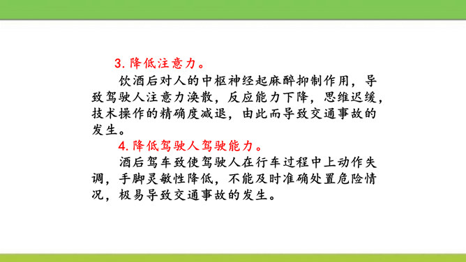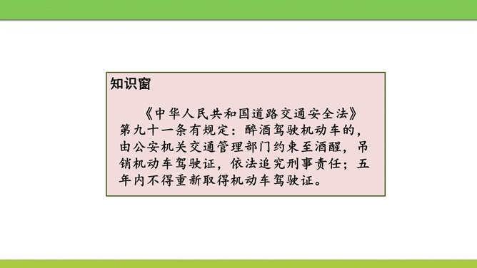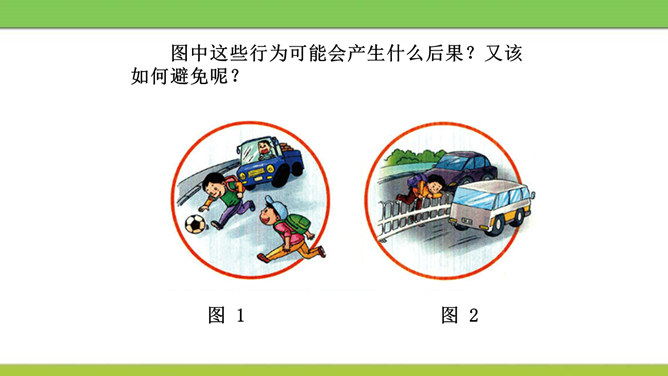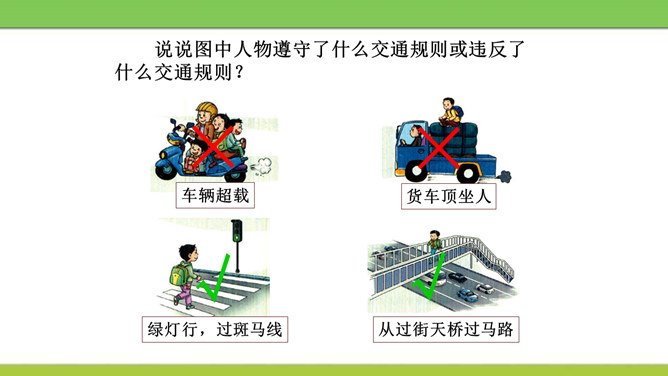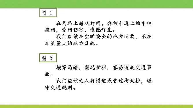 说说图中人物遵守了什么交通规则或违反了什么交通规则?图中这些行为可能会产生什么后果?又该如何避免呢?横穿马路,翻越护栏,容易造成交通事故。我们应该走人行横道或者过街天桥,遵守交通规则。在马路上嬉戏打闹,会被车道上的车辆撞到,受到伤害,遗憾终生。我们应该在空旷安全的地方玩耍,不在车流量大的地方乱跑。酒后驾车,人的视线变模糊,尤其影响对有颜色的信息选择反应中识别功能,使识别过程的时间延长,失误增多,对驾驶人反应的及时性、准确性产生不利的影响。所属专题:安全记心上ppt。