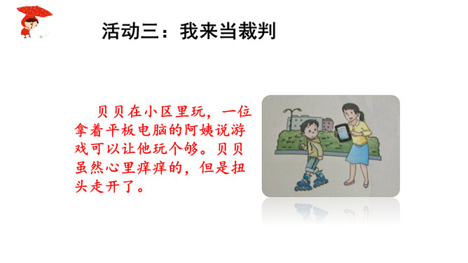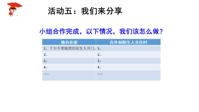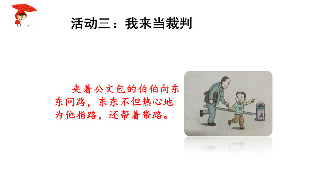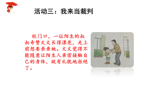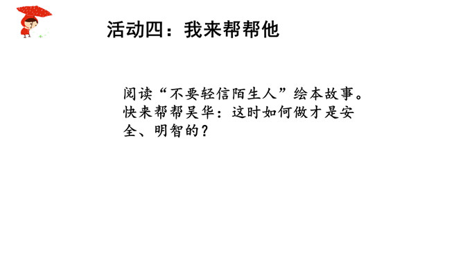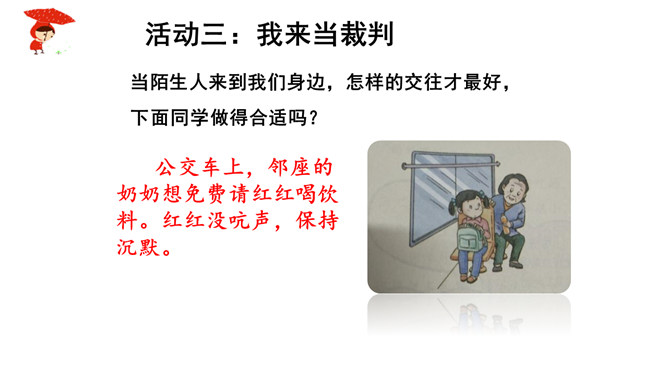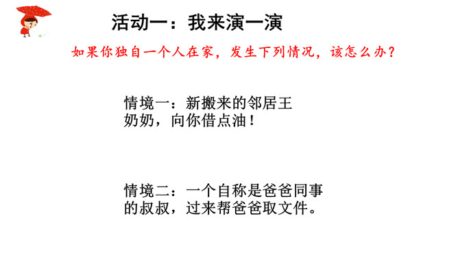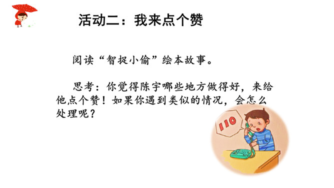 如果你独自一个人在家,发生下列情况,该怎么办?情境一:新搬来的邻居王奶奶,向你借点油!情境二:一个自称是爸爸同事的叔叔,过来帮爸爸取文件。阅读“智捉小偷”绘本故事。思考:你觉得陈宇哪些地方做得好,来给他点个赞!如果你遇到类似的情况,会怎么处理呢?当陌生人来到我们身边,怎样的交往才最好,下面同学做得合适吗?公交车上,邻座的奶奶想免费请红红喝饮料。红红没吭声,保持沉默。夹着公文包的伯伯向东东问路,东东不但热心地为他指路,还帮着带路。所属专题:心中的110ppt。