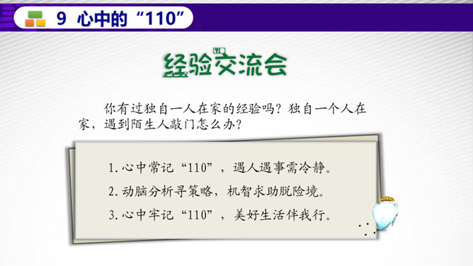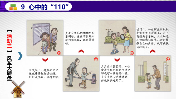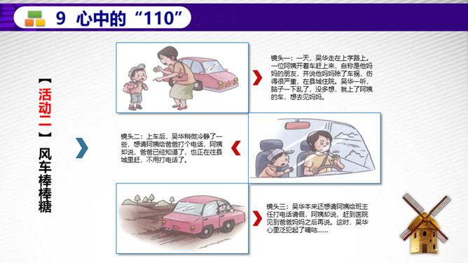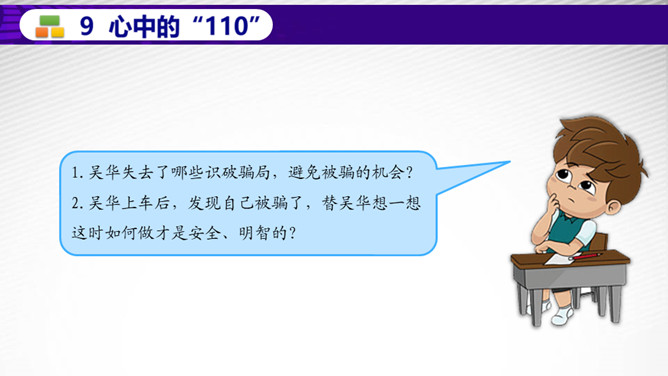 1.小男孩为什么会上当受骗?2.骗子是怎么诱骗小男孩的?小女孩和小男孩的做法有什么不一样?镜头一:一天,吴华走在上学路上。一位阿姨开着车赶上来,自称是他妈妈的朋友,并说他妈妈除了车祸,伤得很严重,在县城住院。吴华一听,脑子一下乱了,没多想,就上了阿姨的车,想去见妈妈。镜头二:上车后,吴华稍微冷静了一些,想请阿姨给爸爸打个电话,阿姨却说,爸爸已经知道了,也正在往县城里赶,不用打电话了。镜头三:吴华本来还想请阿姨给班主任打电话请假,阿姨却说,赶到医院见到爸爸妈妈之后再说。这时,吴华心里泛犯起了嘀咕……所属专题:心中的110ppt。