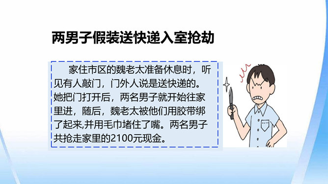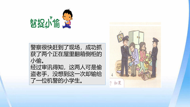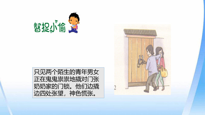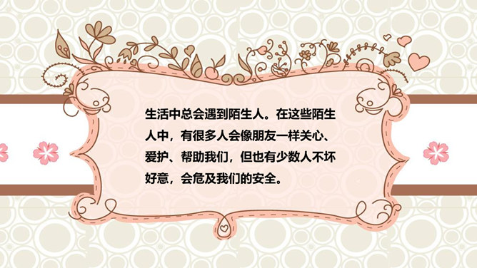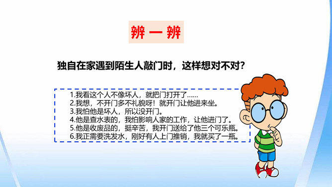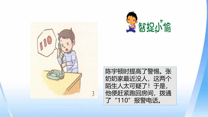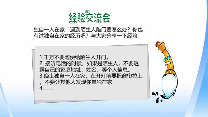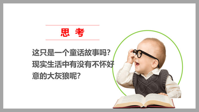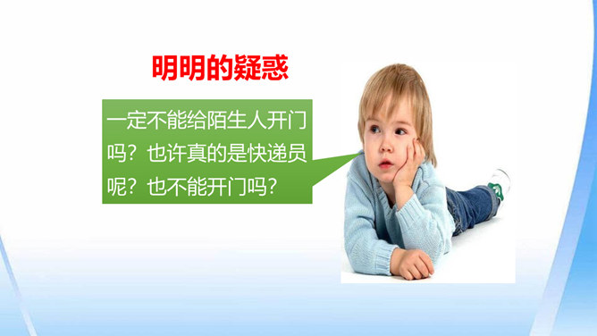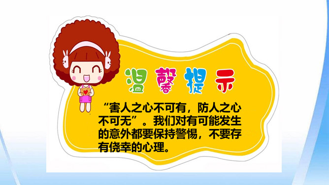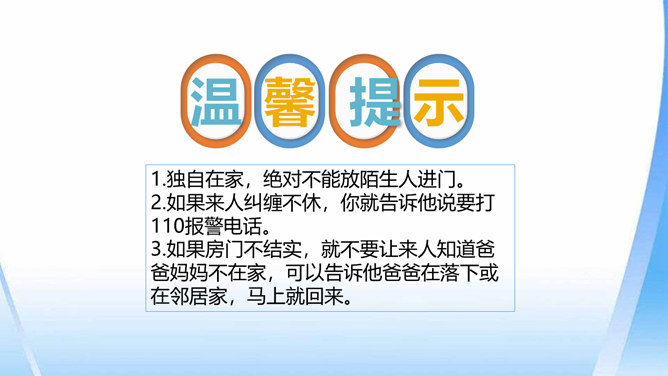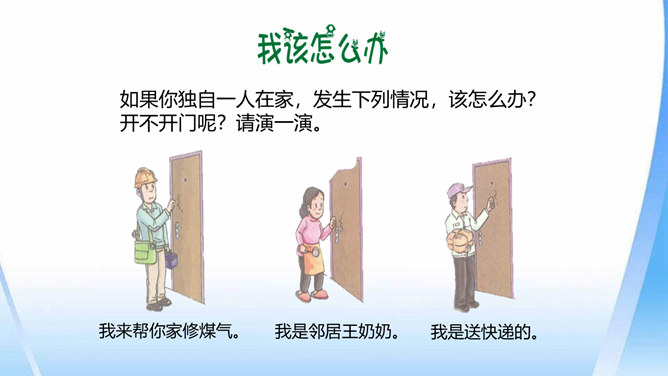 这只是一个童话故事吗?现实生活中有没有不怀好意的大灰狼呢?生活中总会遇到陌生人。在这些陌生人中,有很多人会像朋友一样关心、爱护、帮助我们,但也有少数人不坏好意,会危及我们的安全。如果你独自一人在家,发生下列情况,该怎么办?开不开门呢?请演一演。独自一人在家,遇到陌生人敲门要怎么办?你也有过独自在家的经历吧?与大家分享一下经验。不要随便给陌生人开门。接听电话的时候,如果是陌生人,不要透露自己的家庭地址,姓名,等个人信息。晚上独自一人在家,在开灯前要把窗帘拉上,不要让其他人发现你单独在家。所属专题:心中的110ppt。