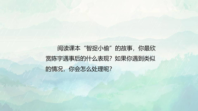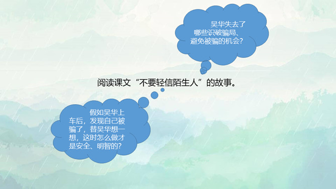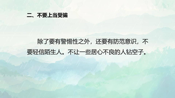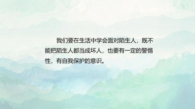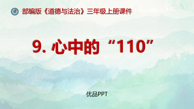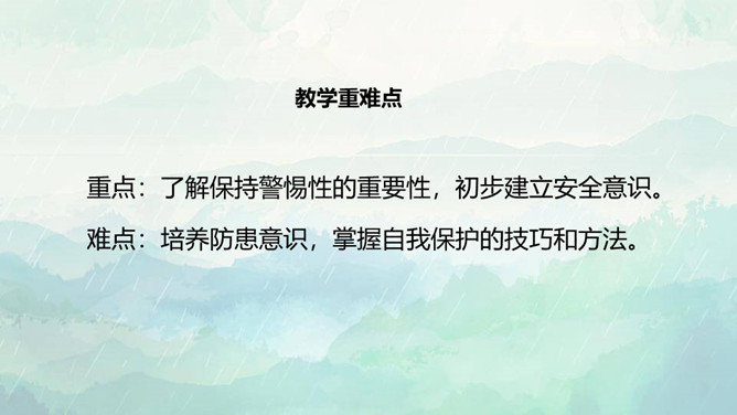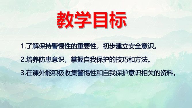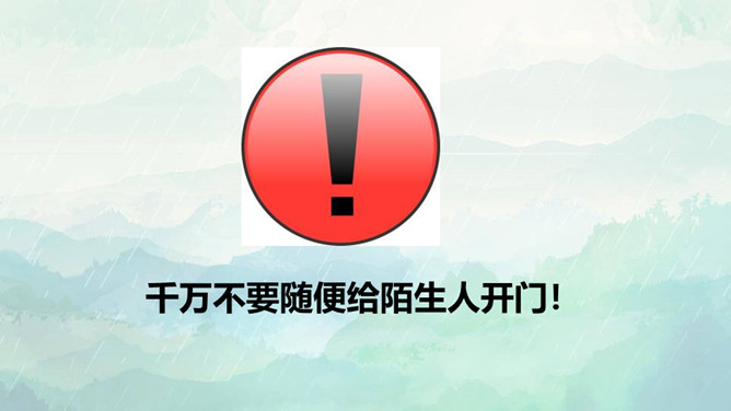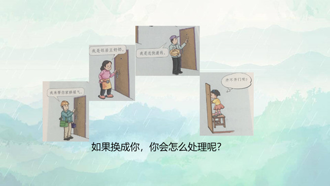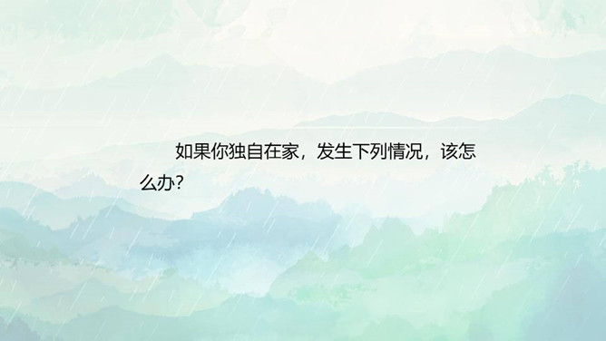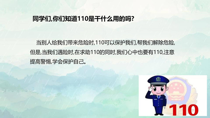 1.了解保持警惕性的重要性,初步建立安全意识。2.培养防患意识,掌握自我保护的技巧和方法。3.在课外能积极收集警惕性和自我保护意识相关的资料。重点:了解保持警惕性的重要性,初步建立安全意识。难点:培养防患意识,掌握自我保护的技巧和方法。同学们,你们知道110是干什么用的吗? 当别人给我们带来危险时,110可以保护我们,帮我们解除危险,但是,当我们遇险时,在求助110的同时,我们心中也要有110,注意提高警惕,学会保护自己。如果你独自在家,发生下列情况,该怎么办?所属专题:心中的110ppt。