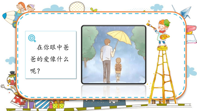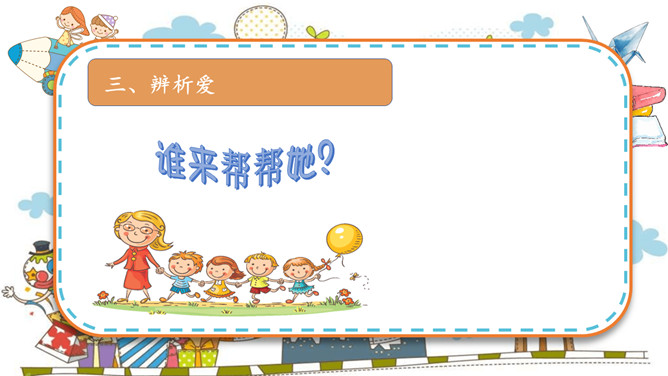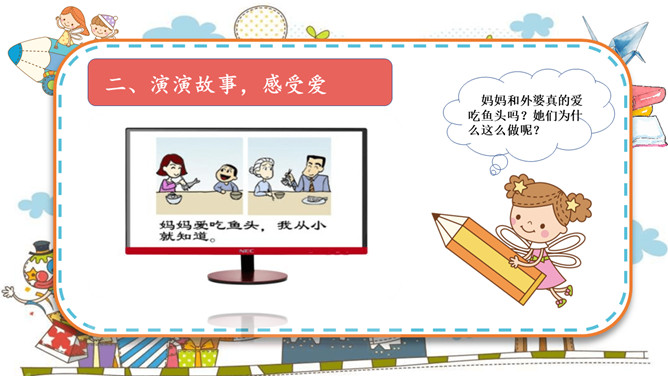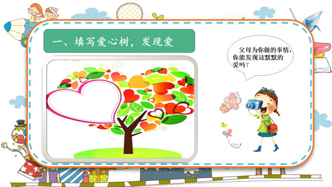 一、填写爱心树,发现爱。父母为你做的事情,你能发现这默默的爱吗?二、演演故事,感受爱。妈妈和外婆真的爱吃鱼头吗?她们为什么这么做呢?父母关爱你的感人故事也一定不少,讲给大家听听吧!三、辨析爱。四、朗诵诗歌,领悟爱。在你眼中爸爸的爱像什么呢?课后小任务:把今天学习到的诗歌读给自己妈妈听,试着自己给爸爸也写一首小诗!所属专题:父母多爱我ppt。