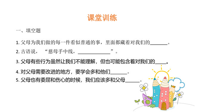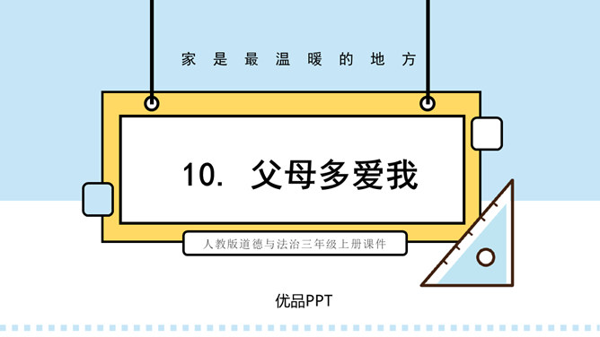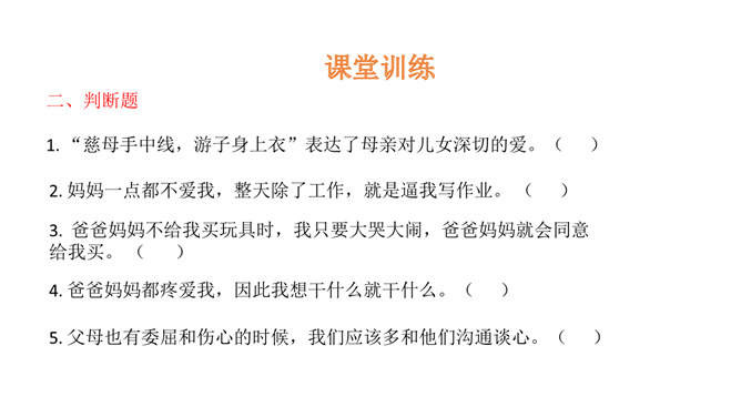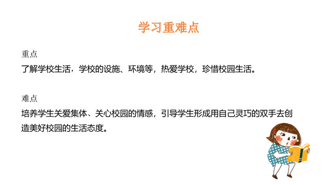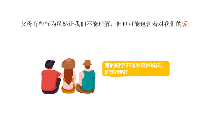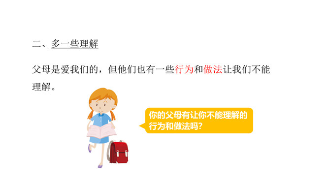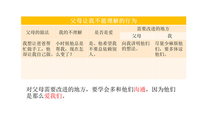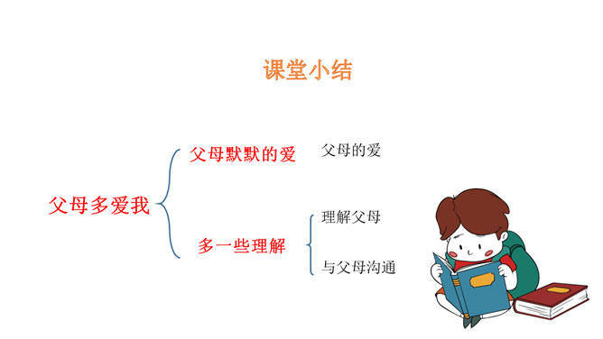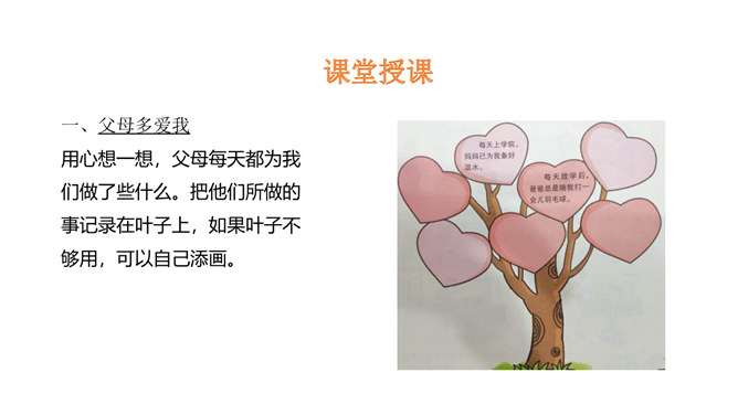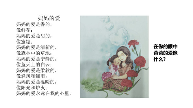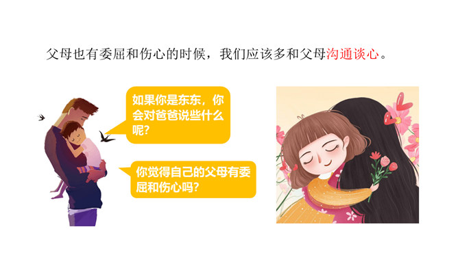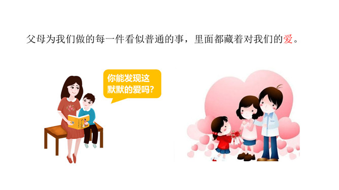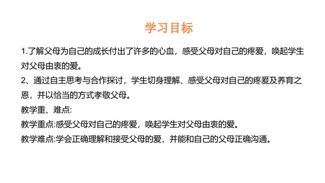 学习目标:1.了解父母为自己的成长付出了许多的心血,感受父母对自己的疼爱,唤起学生对父母由衷的爱。2、通过自主思考与合作探讨,学生切身理解、感受父母对自己的疼爰及养育之恩,并以恰当的方式孝敬父母。教学重点:感受父母对自己的疼爱,唤起学生对父母由衷的爱。教学难点:学会正确理解和接受父母的爱,并能和自己的父母正确沟通。了解学校生活,学校的设施、环境等,热爱学校,珍惜校园生活。培养学生关爱集体、关心校园的情感,引导学生形成用自己灵巧的双手去创造美好校园的生活态度。所属专题:父母多爱我ppt。