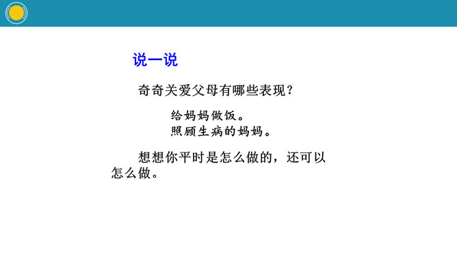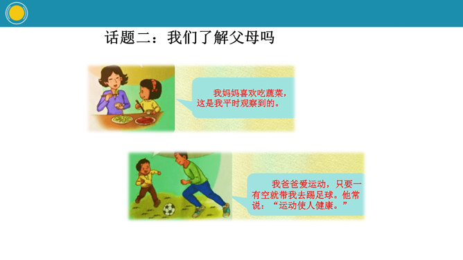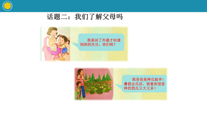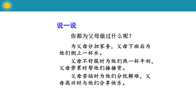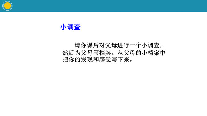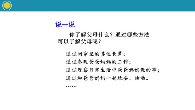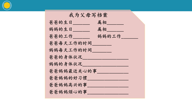 你了解父母什么?通过哪些方法可以了解父母呢?通过问家里的其他长辈;通过参观爸爸妈妈的工作;通过观察日常生活中爸爸妈妈做的事;通过和爸爸妈妈一起玩耍、活动。请你课后对父母进行一个小调查,然后为父母写档案。从父母的小档案中把你的发现和感受写下来。你都为父母做过什么呢?为父母分担家务,父母下班后为他们倒上一杯水。父母不舒服时为他们热一杯牛奶,父母劳累时帮他们捶捶背。父母苦恼时为他们分忧解难,父母高兴时与他们分享快乐。你可以用什么方法帮助父母改掉其他不健康的习惯呢?所属专题:爸爸妈妈在我心中ppt。