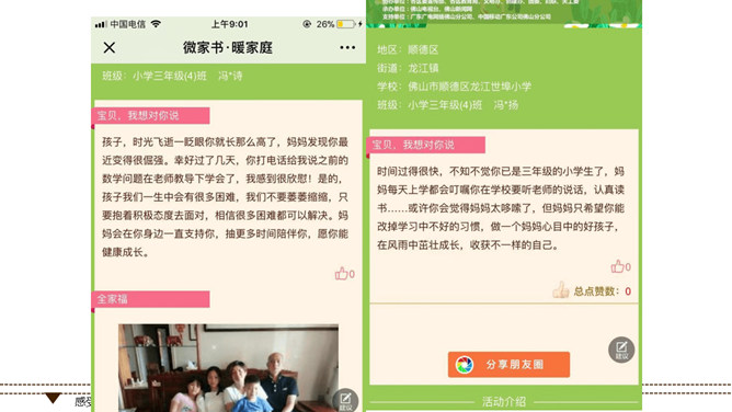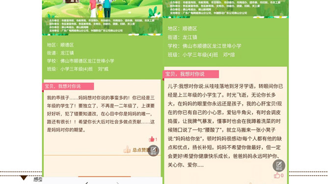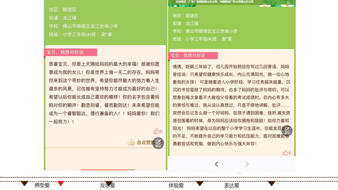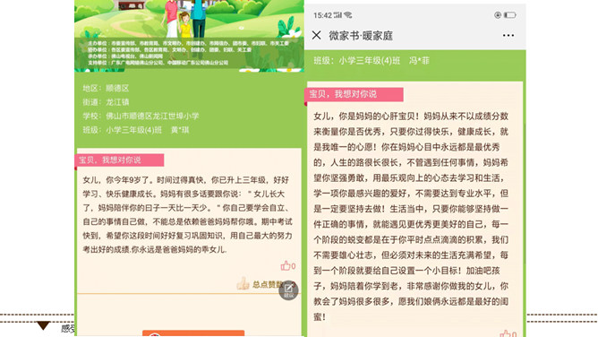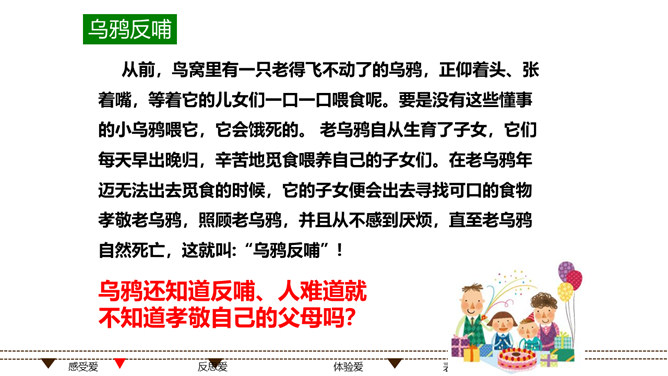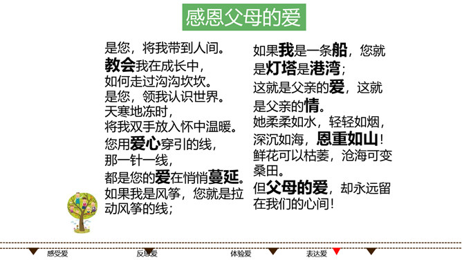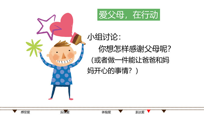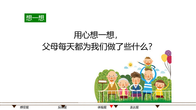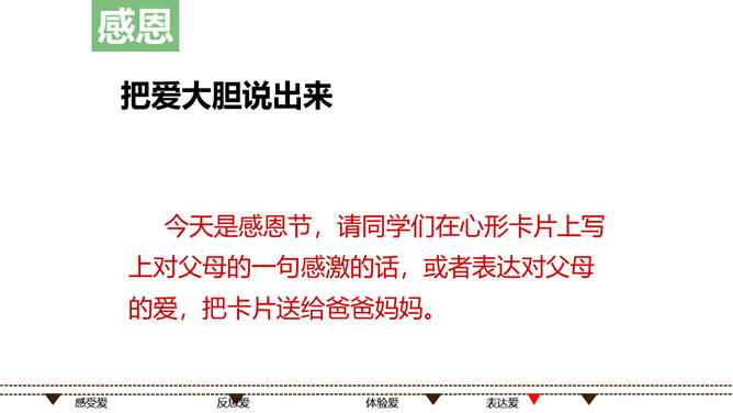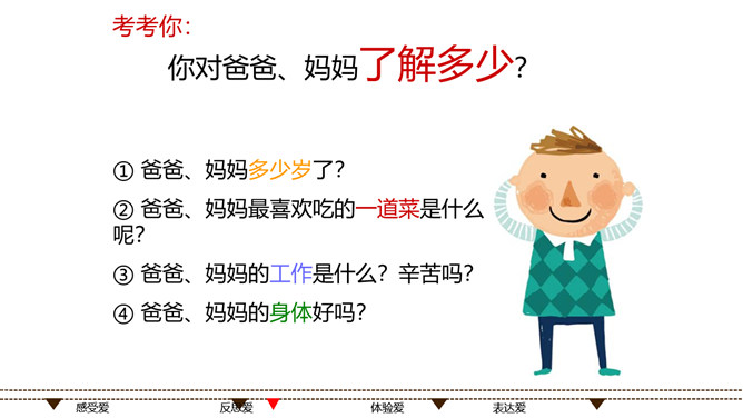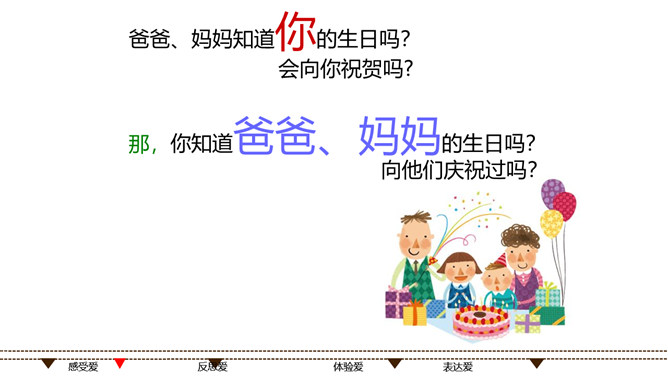 爸爸、妈妈知道你的生日吗?会向你祝贺吗?那,你知道爸爸、妈妈的生日吗?向他们庆祝过吗?考考你:你对爸爸、妈妈了解多少?爸爸、妈妈多少岁了?爸爸、妈妈最喜欢吃的一道菜是什么呢?爸爸、妈妈的工作是什么?辛苦吗?爸爸、妈妈的身体好吗?用心想一想,父母每天都为我们做了些什么?小组讨论:你想怎样感谢父母呢?(或者做一件能让爸爸和妈妈开心的事情?)今天是感恩节,请同学们在心形卡片上写上对父母的一句感激的话,或者表达对父母的爱,把卡片送给爸爸妈妈。所属专题:爸爸妈妈在我心中ppt。