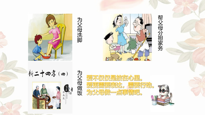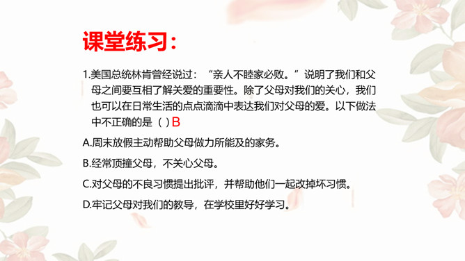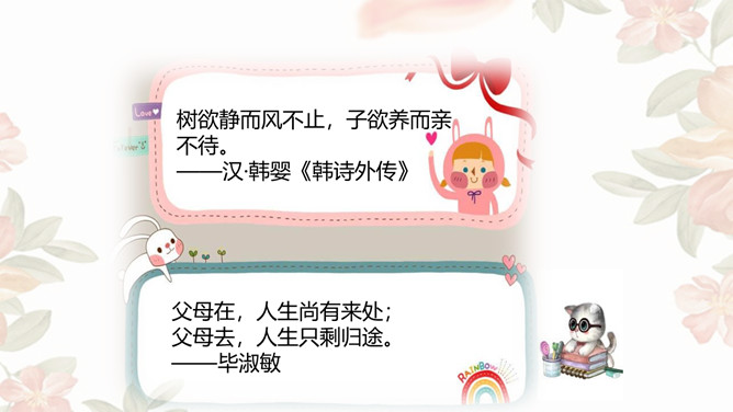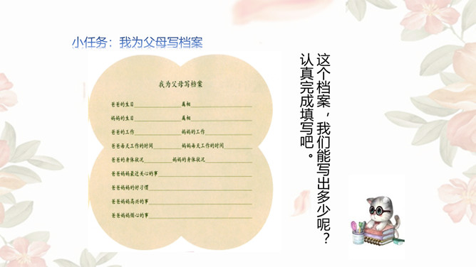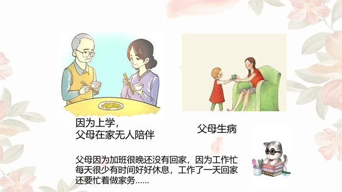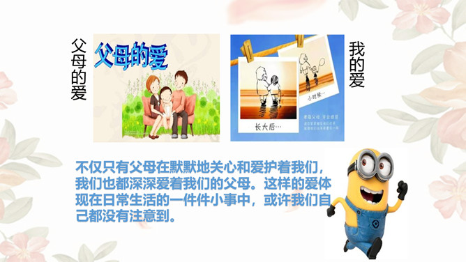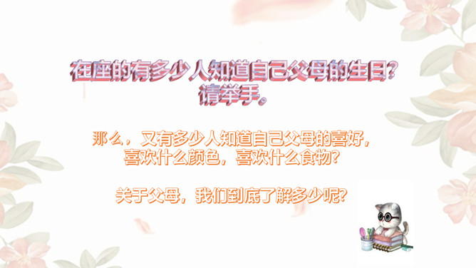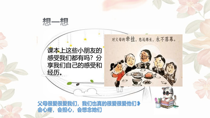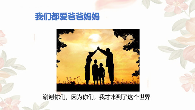 谢谢你们,因为你们,我才来到了这个世界。不仅只有父母在默默地关心和爱护着我们,我们也都深深爱着我们的父母。这样的爱体现在日常生活的一件件小事中,或许我们自己都没有注意到。父母因为加班很晚还没有回家,因为工作忙每天很少有时间好好休息,工作了一天回家还要忙着做家务……课本上这些小朋友的感受我们都有吗?分享我们自己的感受和经历。父母很爱很爱我们,我们也真的很爱很爱他们会心疼,会担心,会想念她们。在座的有多少人知道自己父母的生日?请举手。所属专题:爸爸妈妈在我心中ppt。