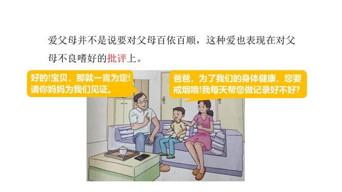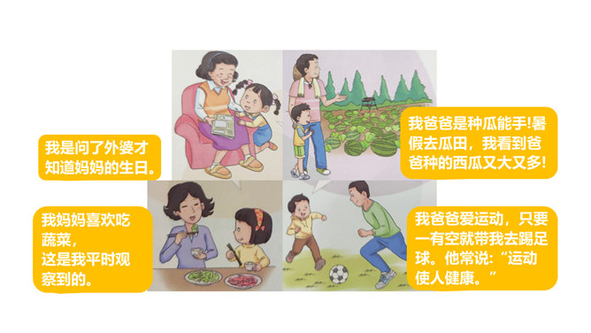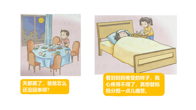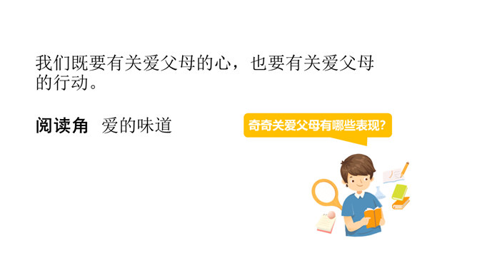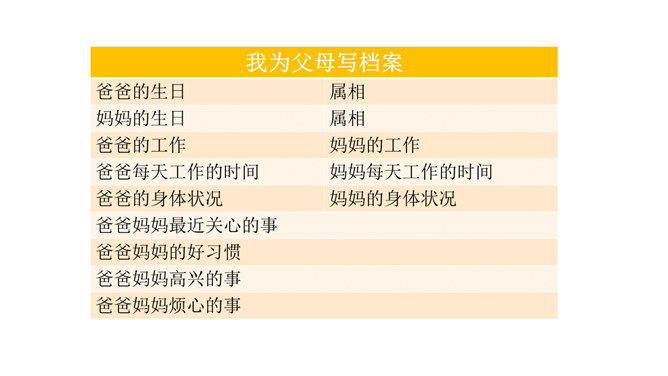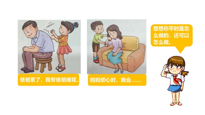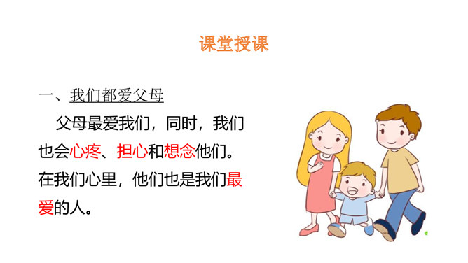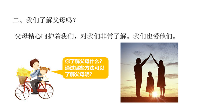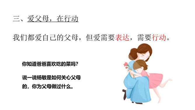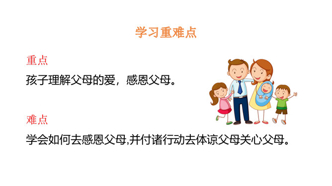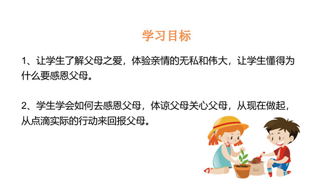 让学生了解父母之爱,体验亲情的无私和伟大,让学生懂得为什么要感恩父母。学生学会如何去感恩父母,体谅父母关心父母,从现在做起,从点滴实际的行动来回报父母。孩子理解父母的爱,感恩父母。学会如何去感恩父母,并付诸行动去体谅父母关心父母。父母最爱我们,同时,我们也会心疼、担心和想念他们。在我们心里,他们也是我们最爱的人。我们都爱自己的父母,但爱需要表达,需要行动。你知道爸爸喜欢吃的菜吗?我们既要有关爱父母的心,也要有关爱父母的行动。所属专题:爸爸妈妈在我心中ppt。