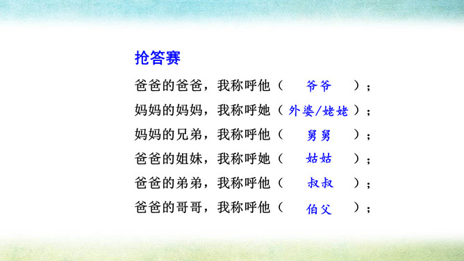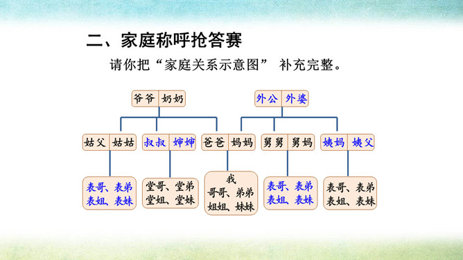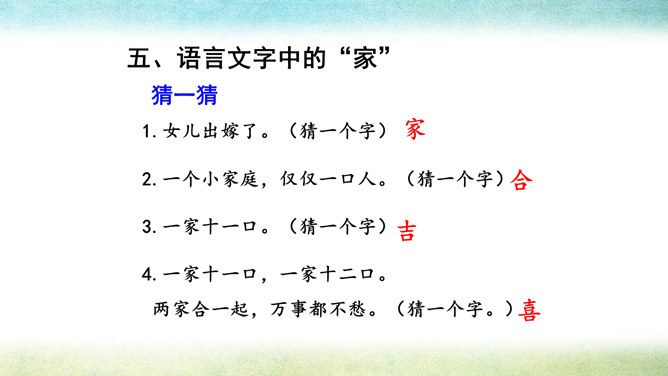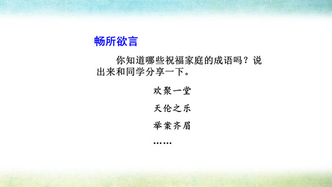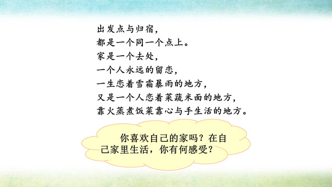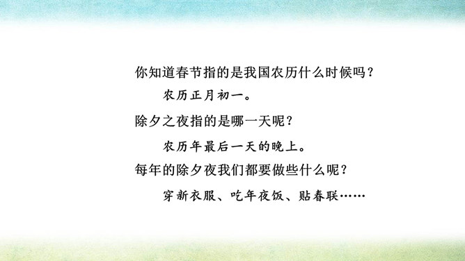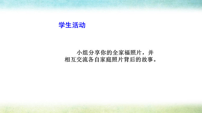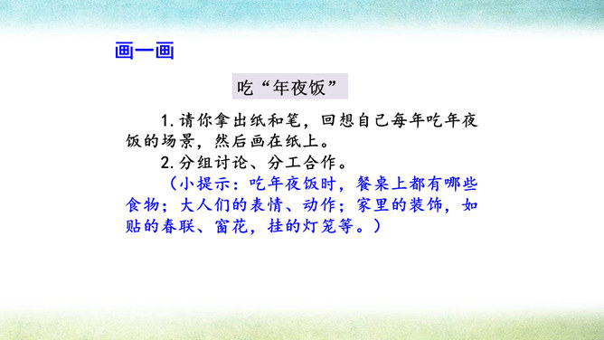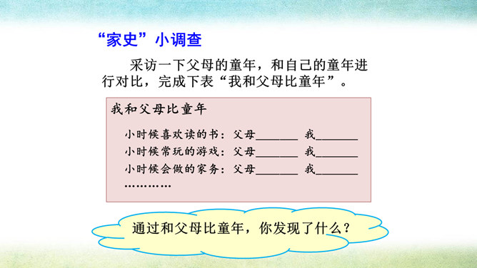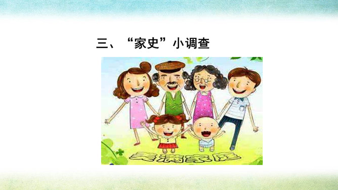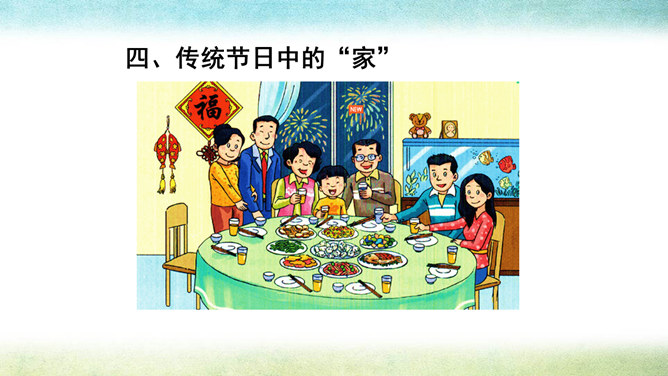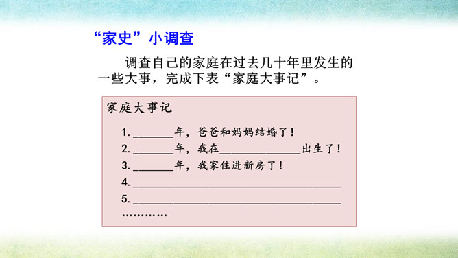 你喜欢自己的家吗?在自己家里生活,你有何感受?小组分享你的全家福照片,并相互交流各自家庭照片背后的故事。调查自己的家庭在过去几十年里发生的一些大事,完成下表“家庭大事记”。采访一下父母的童年,和自己的童年进行对比,完成下表“我和父母比童年”。通过和父母比童年,你发现了什么?你知道春节指的是我国农历什么时候吗?农历正月初一。除夕之夜指的是哪一天呢?农历年最后一天的晚上。每年的除夕夜我们都要做些什么呢?穿新衣服、吃年夜饭、贴春联……所属专题:家庭的记忆ppt。